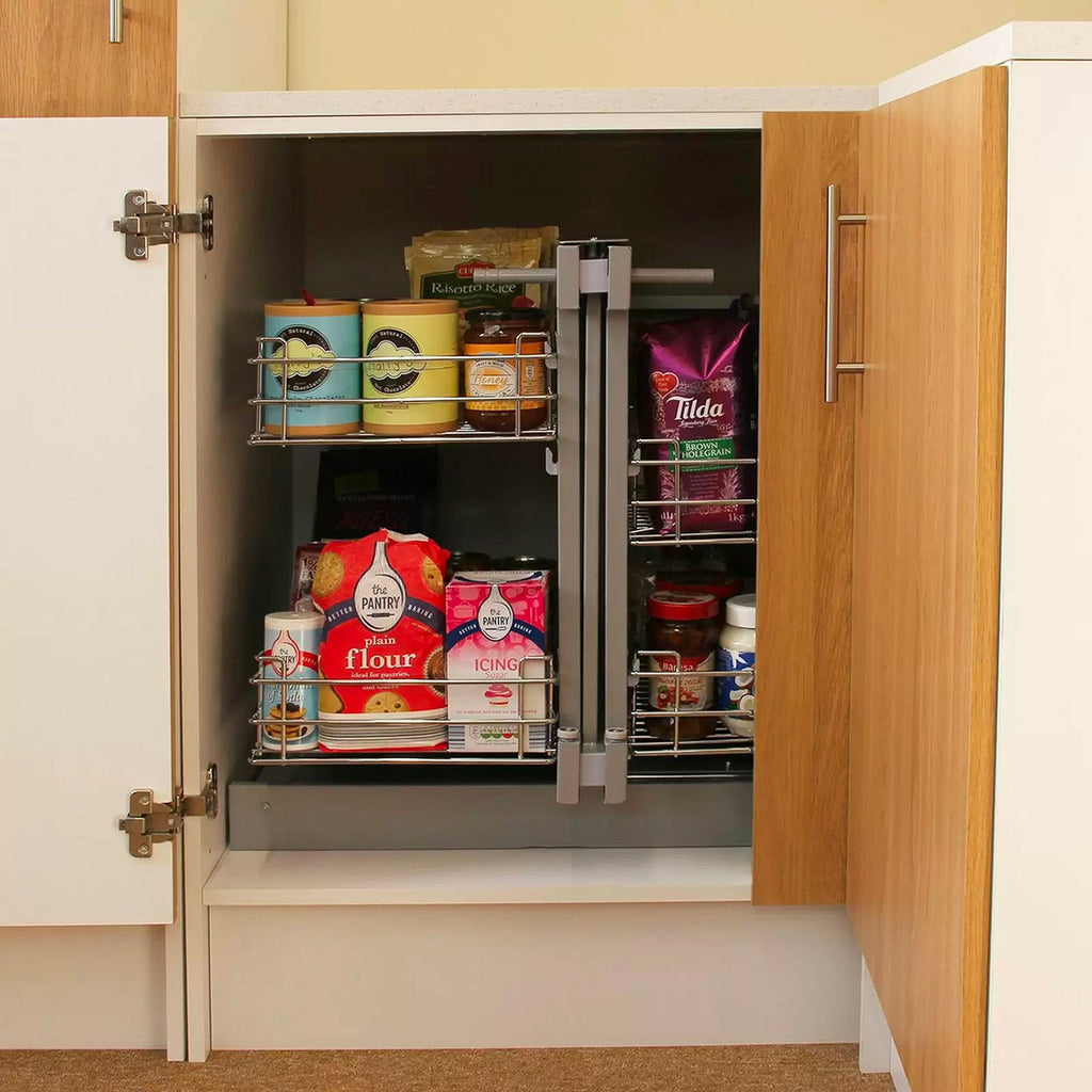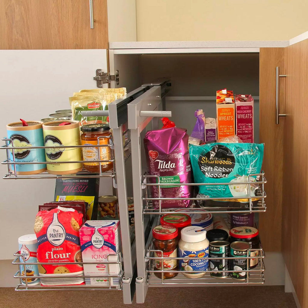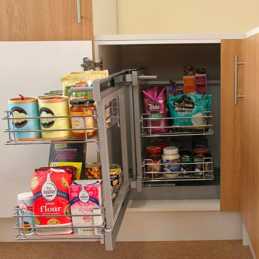 Se hai un mobile da cucina con angolo cieco, massimizza lo spazio con questo set di cestelli estraibili in metallo.