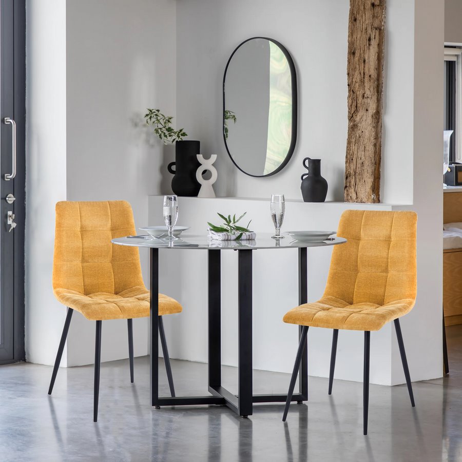 Sei in cerca di un set da 4 sedie dal colore vivace? La sedia Chris in tessuto giallo è la scelta ideale! Le gambe in metallo nero sono state scelte per dare un tocco di stile e funzionalità alla sedia. Sono un'ottima soluzione d'arredo per il tuo salotto o per la tua sala da pranzo, grazie alla doppia imbottitura in tessuto trapuntato, su seduta e schienale, donando così comfort ed eleganza.