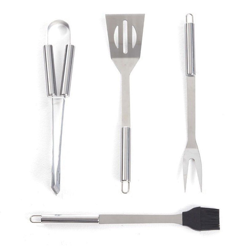 - Bestehend aus 1 Gabel, 1 Pfannenwender, 1 Zange, 1 Bürste mit Silikonborsten