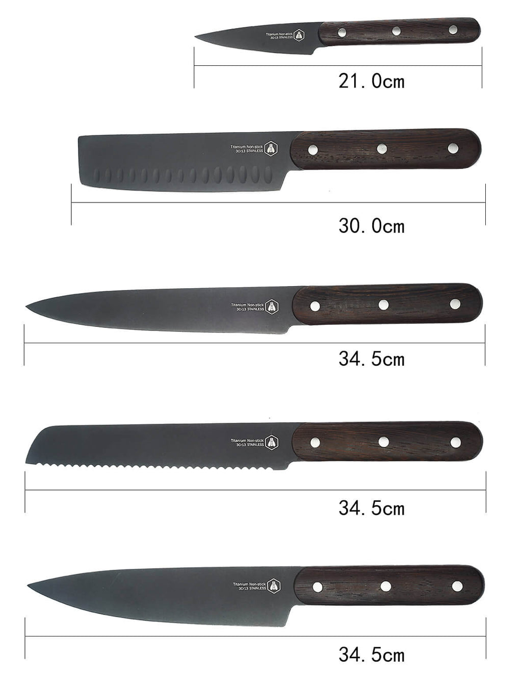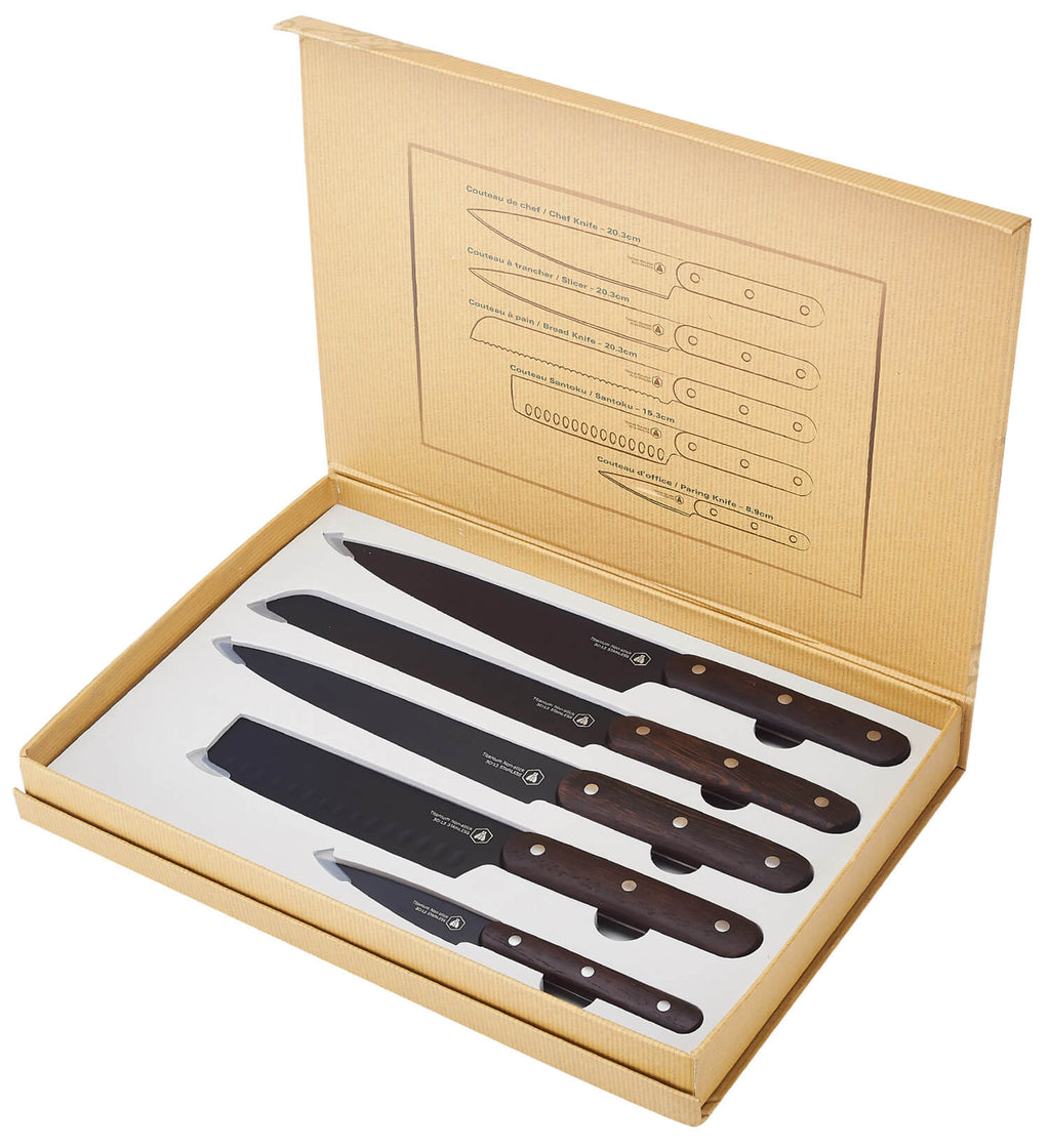 Set mit 5 Küchenmessern, schwarze Klinge, Wenge-Griff