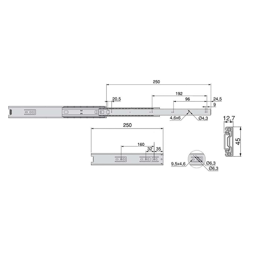 Kugelführungen mit Vollauszug aus verzinktem Stahl. Dieser Schienentyp passt in einen 45 mm breiten Schlitz an der Seite der Schublade. Sie werden mit Schrauben (nicht im Lieferumfang enthalten) an der Seite des Gehäuses befestigt und verfügen über einen Auslöser für die Demontage. Maximale Belastung bis zu 30 kg.