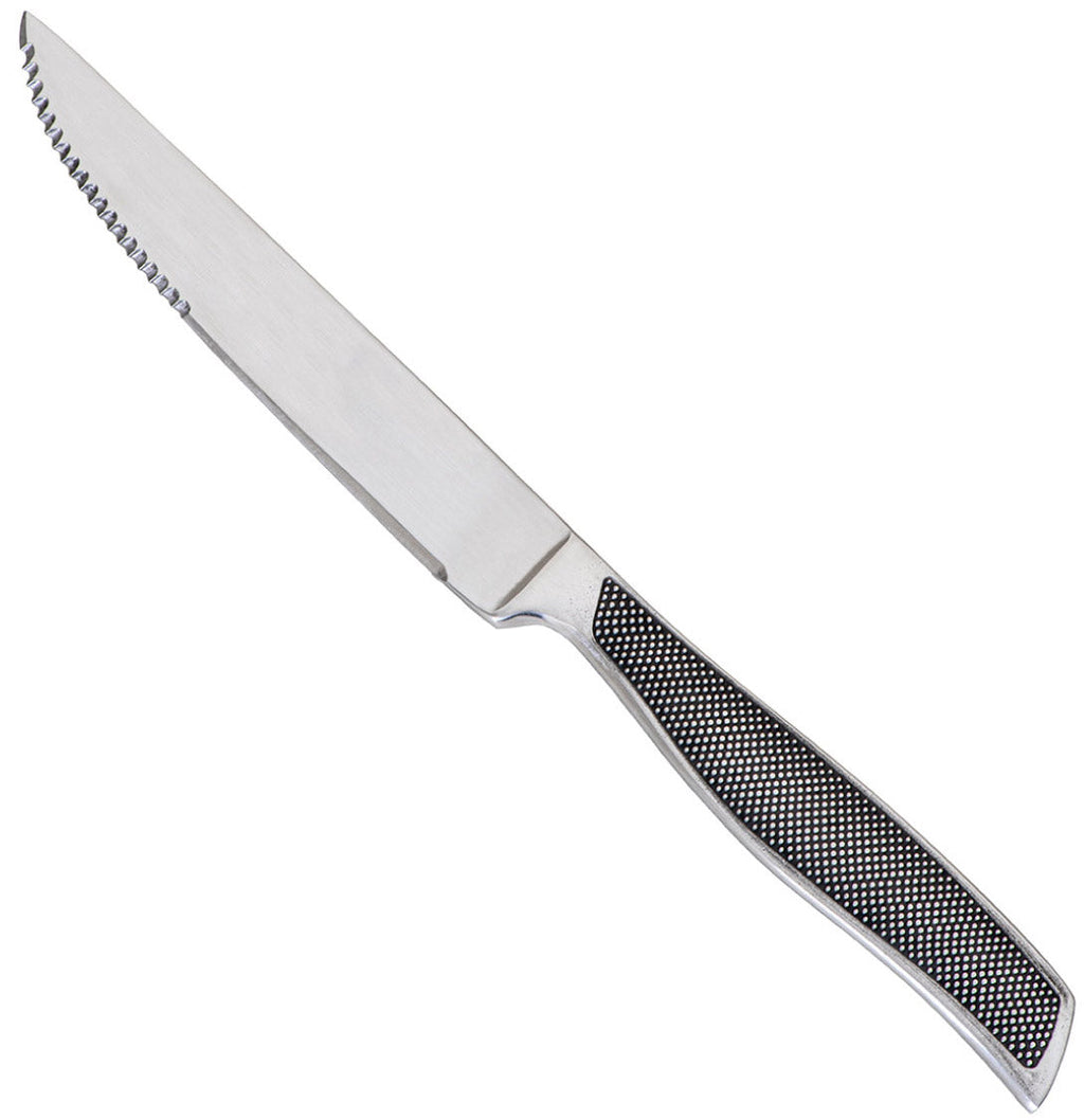 Rambo ist ein einzigartiges Messer seiner Art, es hat einen respektlosen Charakter, ist aber gleichzeitig leicht und nicht zu robust. Es ist vollständig aus Edelstahl, die Klinge ist gezahnt und hat eine gepunktete Textur am Griff. Dank seiner Eigenschaften kann es als Tafelmesser für jeden Tag verwendet werden, es kann in der Spülmaschine gewaschen werden und wird zu Ihrem besten Verbündeten.