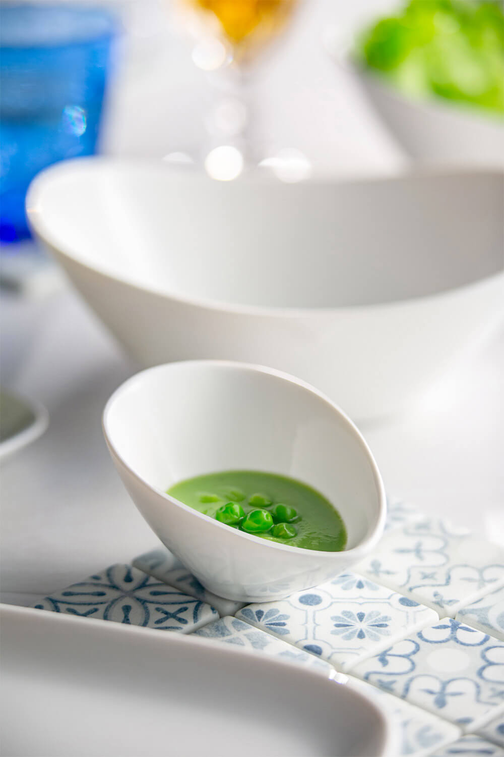 - Formen: schräge Schalen mit einer modernen ovalen Form und einer minimalen Eleganz, die den Tisch raffiniert und aktuell macht. Sie sind besonders geeignet für Finger oder Saucen und passen perfekt zu den Tabletts/Tellern (insbesondere den Trapezen) aus derselben Kollektion.