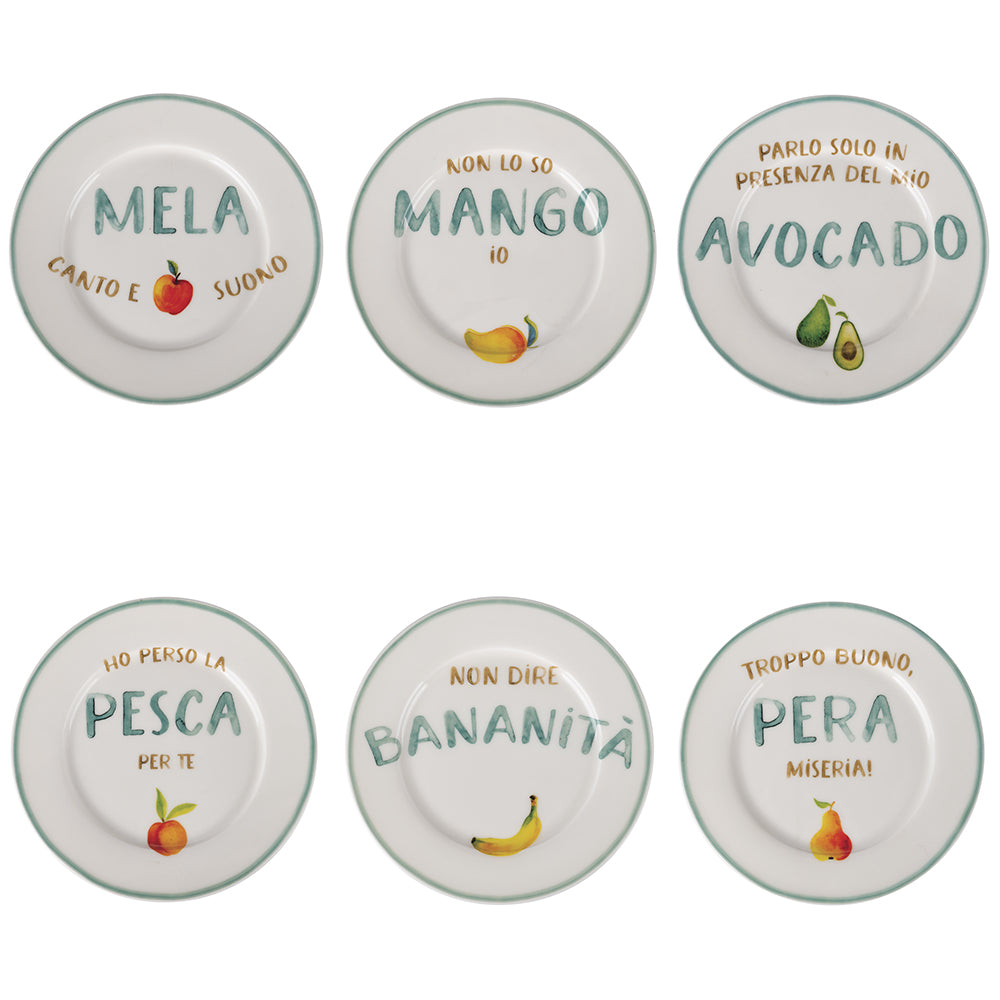 - Disponibili in 6 assortimenti: MELA canto e mela suono; Non lo so MANGO io; Parlo solo in presenza del mio AVOCADO; Ho perso la PESCA per te; Non dire BANANITA ; Troppo buono PERA miseria