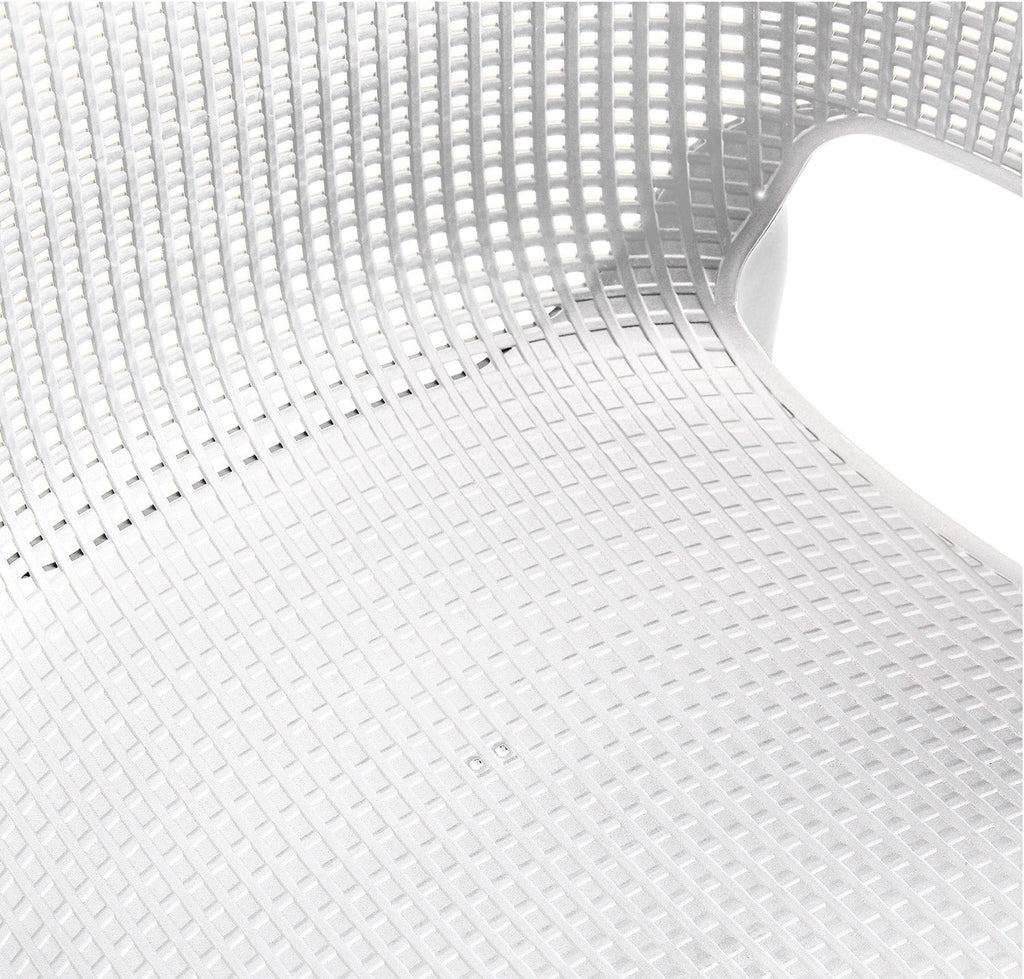 - Struttura realizzata con finitura che fornisce le sensazioni di una superficie liscia, mentre seduta e schienale sono realizzati con finitura che riproduce una trama geometrica intrecciata