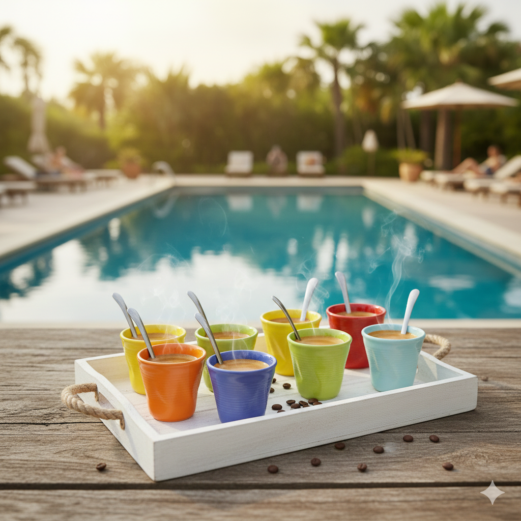 Set aus 6 zerknitterten Kaffeetassen + gewellten Edelstahllöffeln Kaleidos Multicolor .