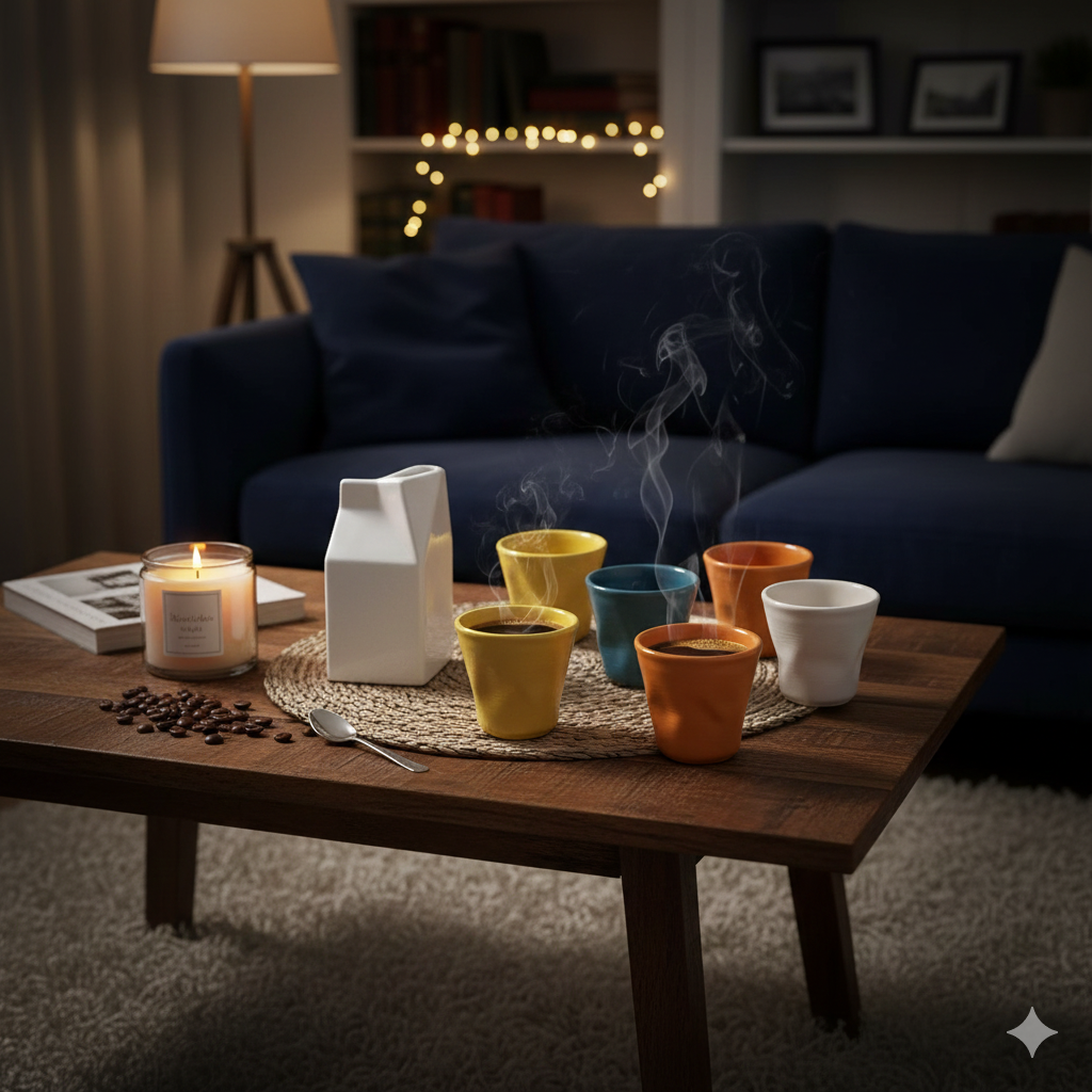 Set aus 6 zerknitterten Kaffeetassen mit Kaleidos Multicolor weißem Milchkännchen.