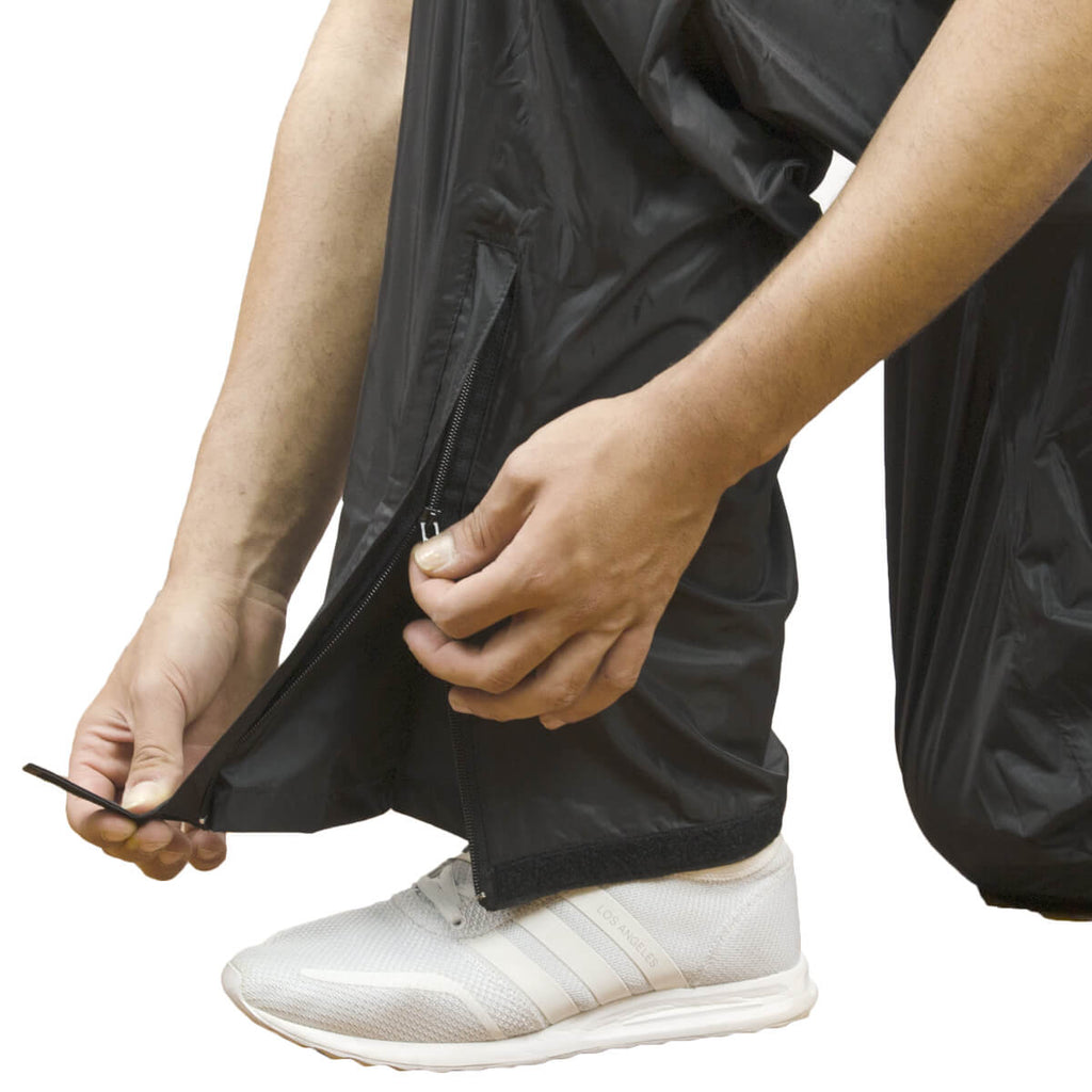 Regenfestes Set aus wasserdichtem Synthetikgewebe, bestehend aus Jacke und Hose. Ausgestattet mit getapten Nähten und reflektierenden Einsätzen. Ideal zum Schutz vor Regen und Wind. Jacke mit Innenfutter und Seitentaschen. Anpassung an Hals und Ärmeln. Vom Kragen abnehmbare Kapuze. Hose mit elastischem Bund, seitlichem Reißverschluss, der bis zum Knie geöffnet und an den Knöcheln verstellbar ist. Maximaler Schutz auf kleinstem Raum: Er lässt sich bequem im mitgelieferten Etui verstauen.