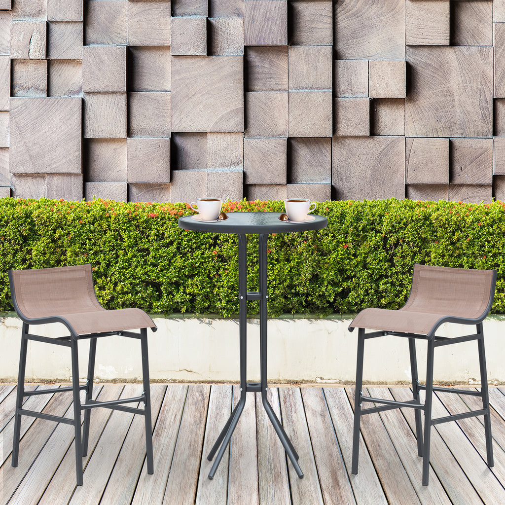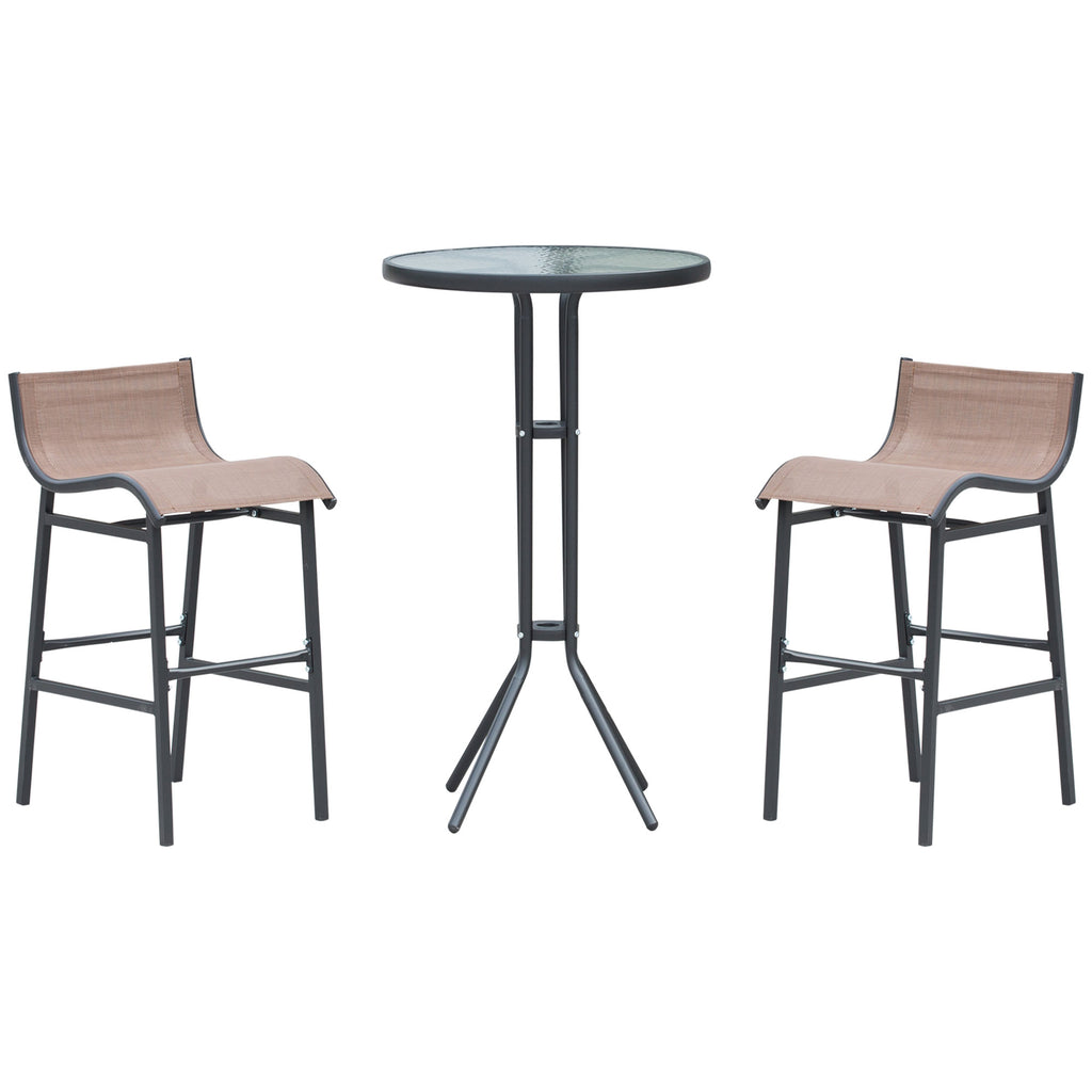 Bar-Set mit hohem Tisch und 2 schwarzen und braunen Gartenhockern