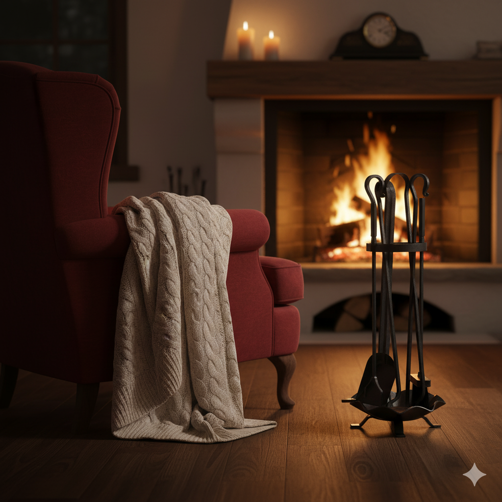 Set Camino 4 Pezzi con Bacinella Forgiato a mano in Ferro Verniciato Nero Opaco
