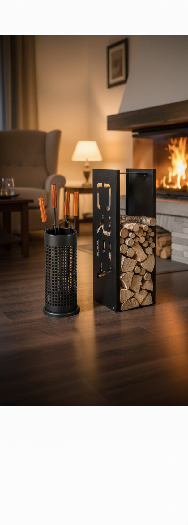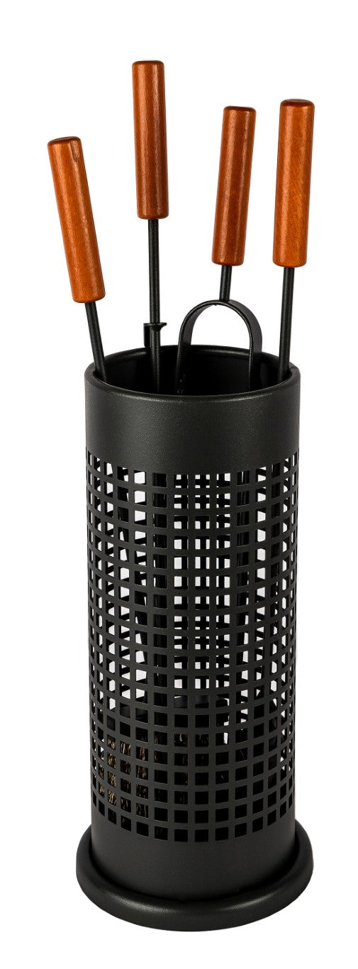 Trespolo realizzato in ferro sp. mm 1.5, rete in ferro sp. mm 1 e tondo in ferro diam. mm 8, verniciato colore grigio martellato, costituito da 4 elementi (paletta, scopino in PVC , attizzino, pinza), con manici cilindrici in legno di faggio verniciati color ciliegio, Made in Italy, facile da pulire con un panno umido, montaggio non richiesto.