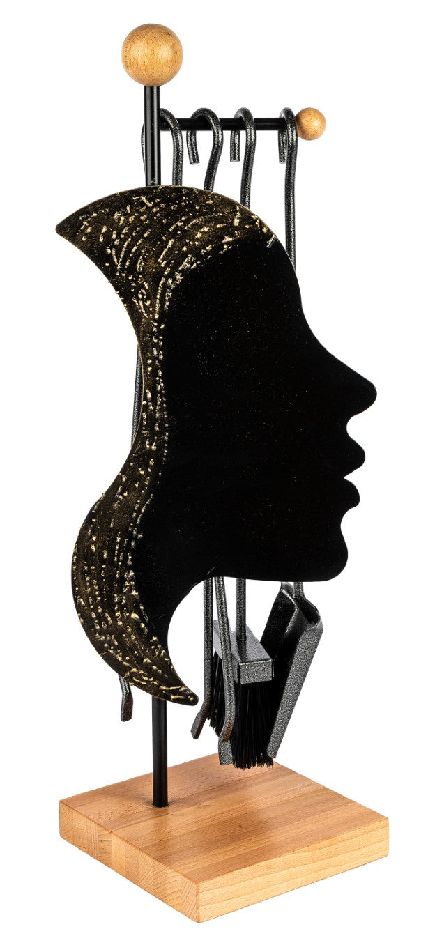 Trespolo realizzato in ferro sp. mm 2 e tondo in ferro diam. mm 8 e 12, verniciato colore nero opaco e sfumatura manuale color oro, base e pomoli in legno di faggio, costituito da 4 elementi (paletta, scopino in PVC, attizzino, pinza). Ogni pezzo è unico, con alcune delle lavorazioni realizzate a mano. Made in Italy, facile da pulire con un panno umido, montaggio non richiesto.