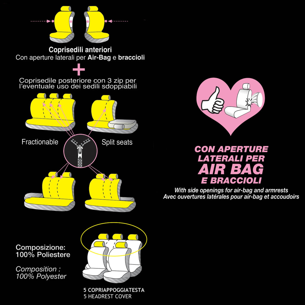 - Der Vordersitzbezug ist auch für Fahrzeuge mit Seitenairbags im Sitz geeignet (beeinträchtigt nicht deren korrekte Funktion)