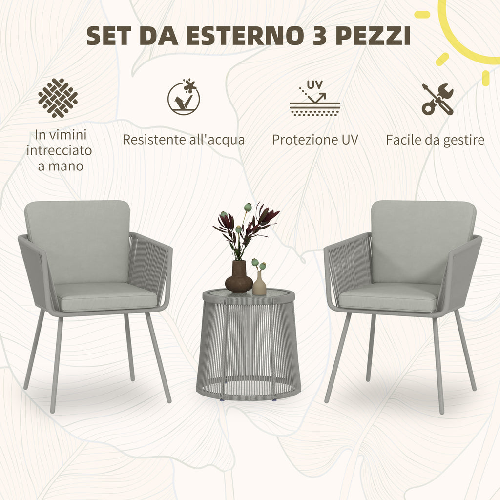 Set da Giardino 2 Sedie in Stile Boho e Tavolino in Vetro in Rattan Grigio Chiaro