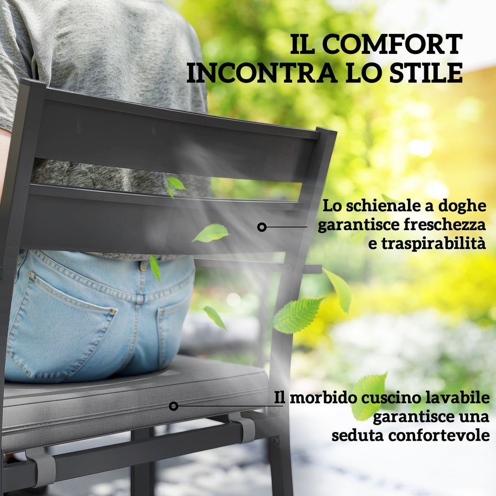 • COMFORT E STILE: Ogni sedia da giardino è dotata di uno schienale ventilato a doghe per un'ottimale traspirabilità e include cuscini morbidi, rimovibili e lavabili. Un perfetto equilibrio tra comfort ed eleganza per i tuoi momenti all'aperto