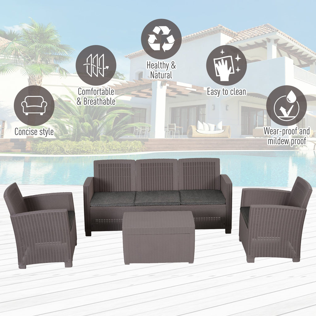 - 4-teiliges Outdoor-Set: 2 Einzelsessel, ein 3-Sitzer-Sofa, 1 Couchtisch und passende Kissen