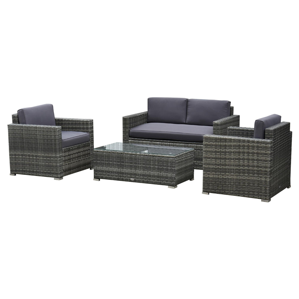 Verschönern Sie Ihren Garten mit dem vierteiligen Rattan-Geflechtmöbel-Set für den Außenbereich. Diese aus PE-Rattan gefertigten Gartenmöbel sind komfortabel und stilvoll und schaffen einen einladenden Raum für Patios und Terrassen. Der Couchtisch verfügt über ein elegantes 5-mm-Hartglas für eine einfache Reinigung. Dekorativ und funktional, das vierteilige Gartenset schafft eine angenehme Umgebung, die Jahr für Jahr verwendet werden kann.