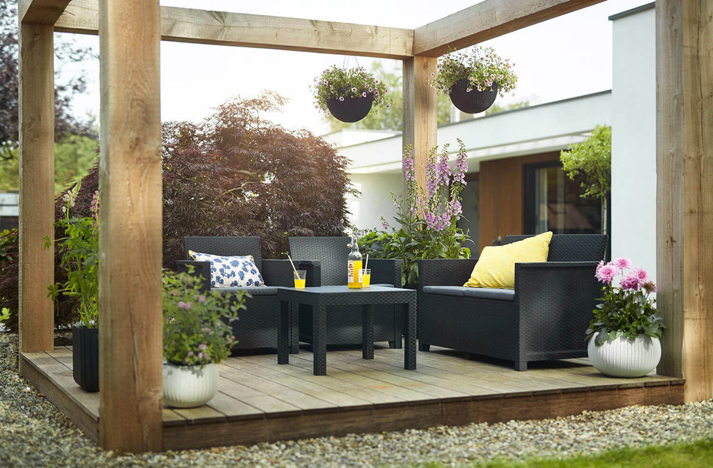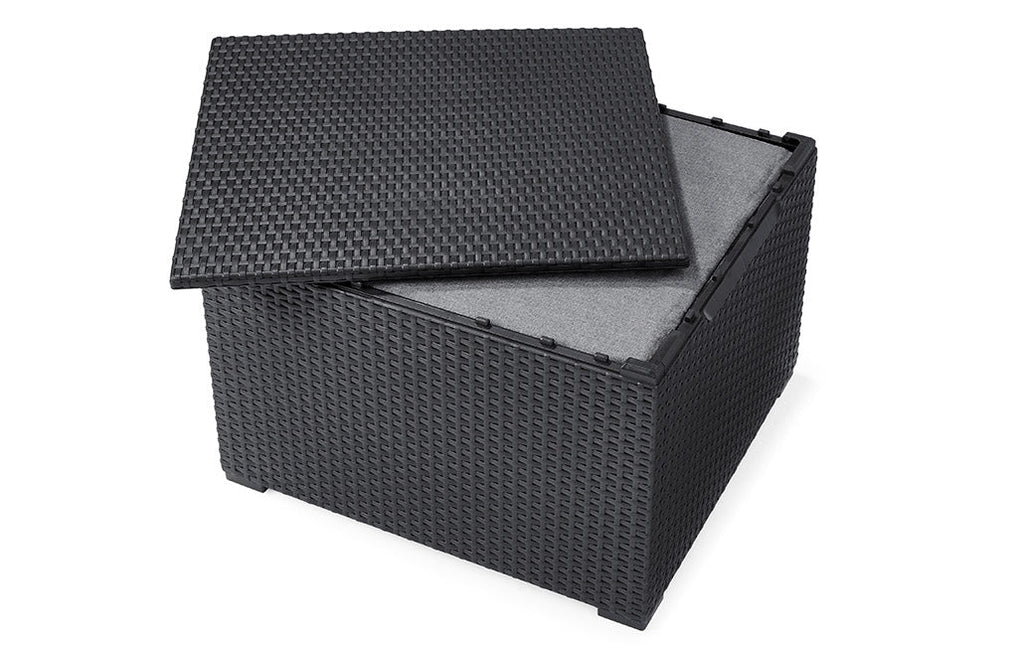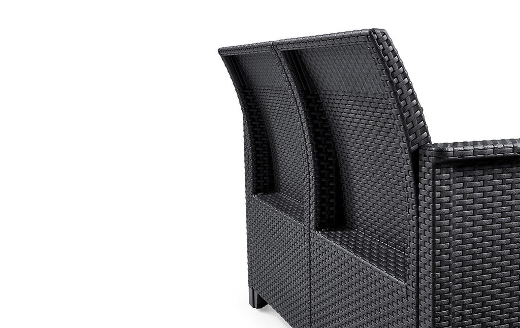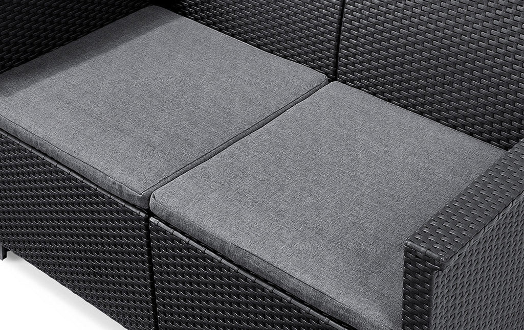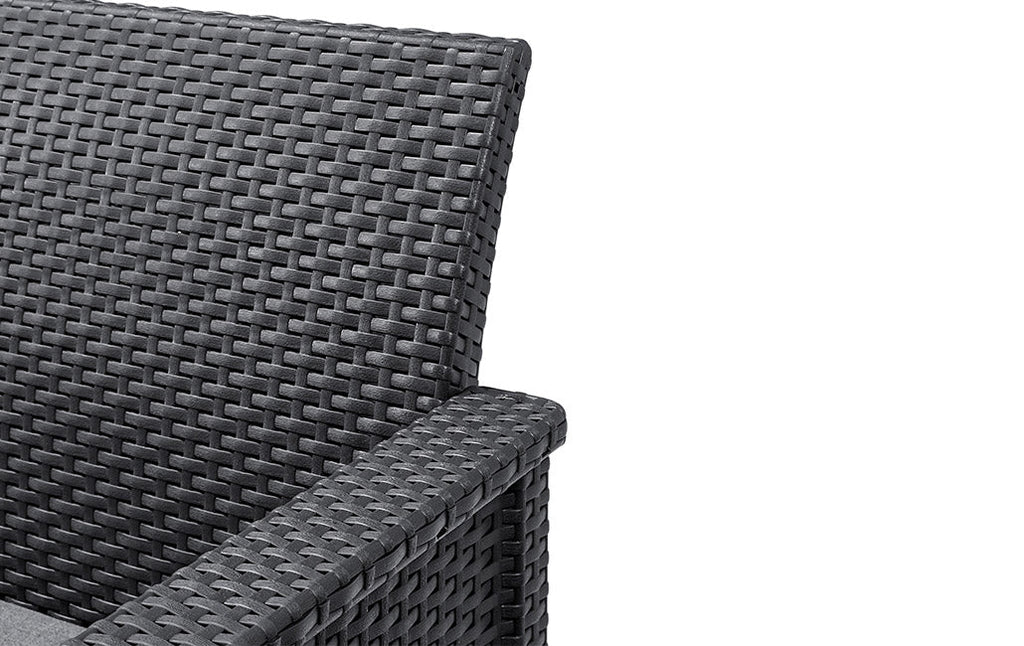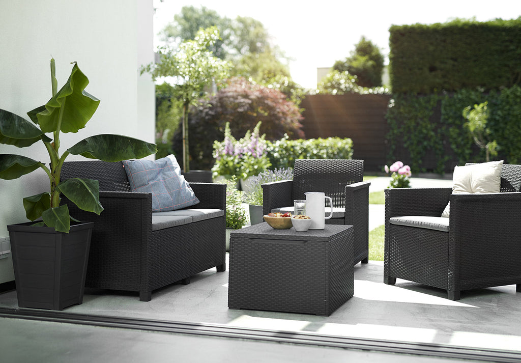 Verwandeln Sie Ihre Außenbereiche mit dem Emma Lounge Set.Das Set beinhaltet ein Zweisitzer-Sofa, zwei Sessel und einen Aufbewahrungstisch. Ausgestattet mit Sitzkissen. Der große Aufbewahrungstisch ist ideal zum Aufbewahren von Kissen, wenn sie nicht verwendet werden. Hergestellt aus wetter- und UV-beständigem Harz, ist es wartungsfrei, verrottungsbeständig und farbecht. Schnelle Montage in nur 20 Minuten, ohne Werkzeug.