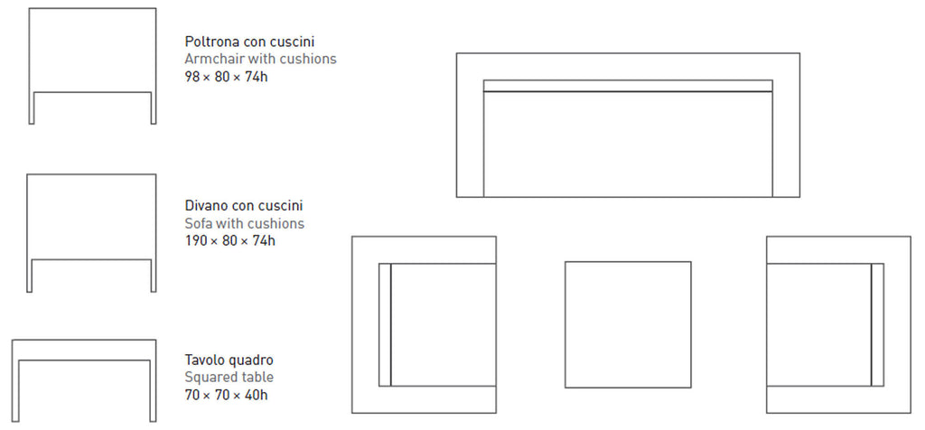 Die einfache, aber gleichzeitig raffinierte und moderne Linie des Wohnzimmers Harmony passt sich perfekt jedem Garten oder Balkon an und wird zu einer grundlegenden Ecke, in der Sie angenehme Momente im Freien in Gesellschaft Ihrer liebsten Freunde verbringen können. Es ist perfekt für den Außenbereich geeignet, da es aus speziell behandelten Materialien hergestellt wird, um maximale Haltbarkeit und Qualität zu gewährleisten.