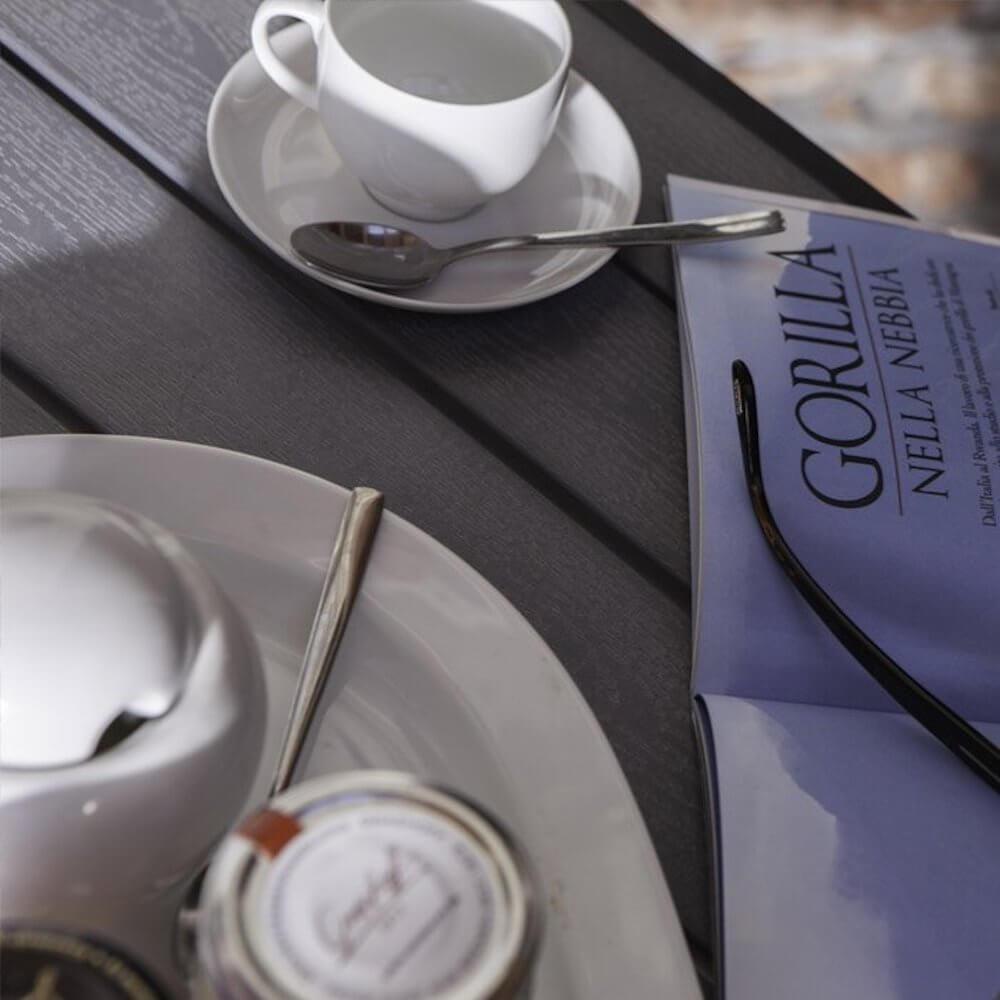 Set aus lackiertem Metall und Polywood, zwei vielseitige und robuste Materialien.