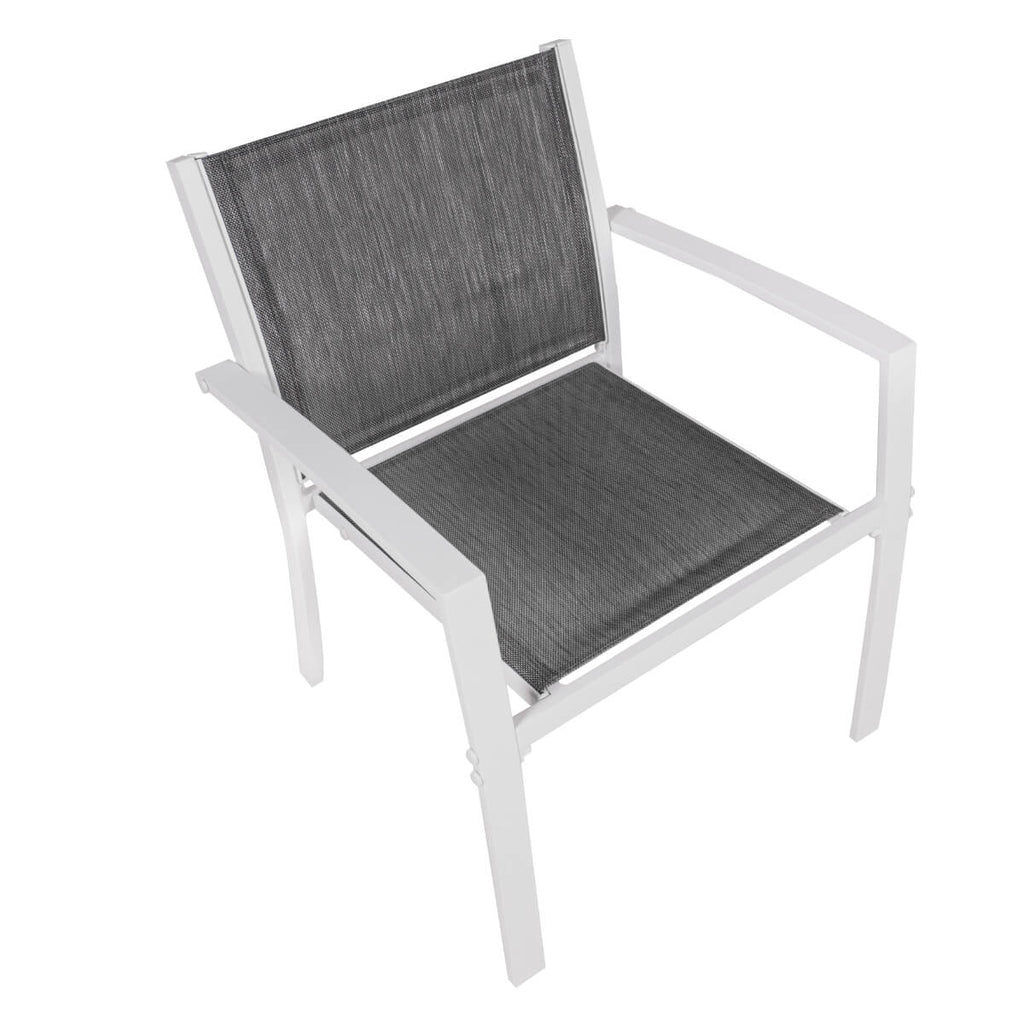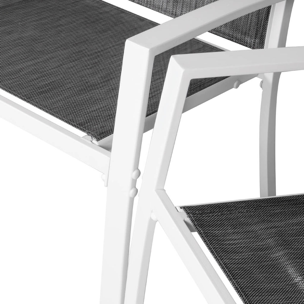 Das Set hat einen Sitz aus Textilene und eine Struktur aus lackiertem Eisen mit einer Garantie von 2 Jahren .