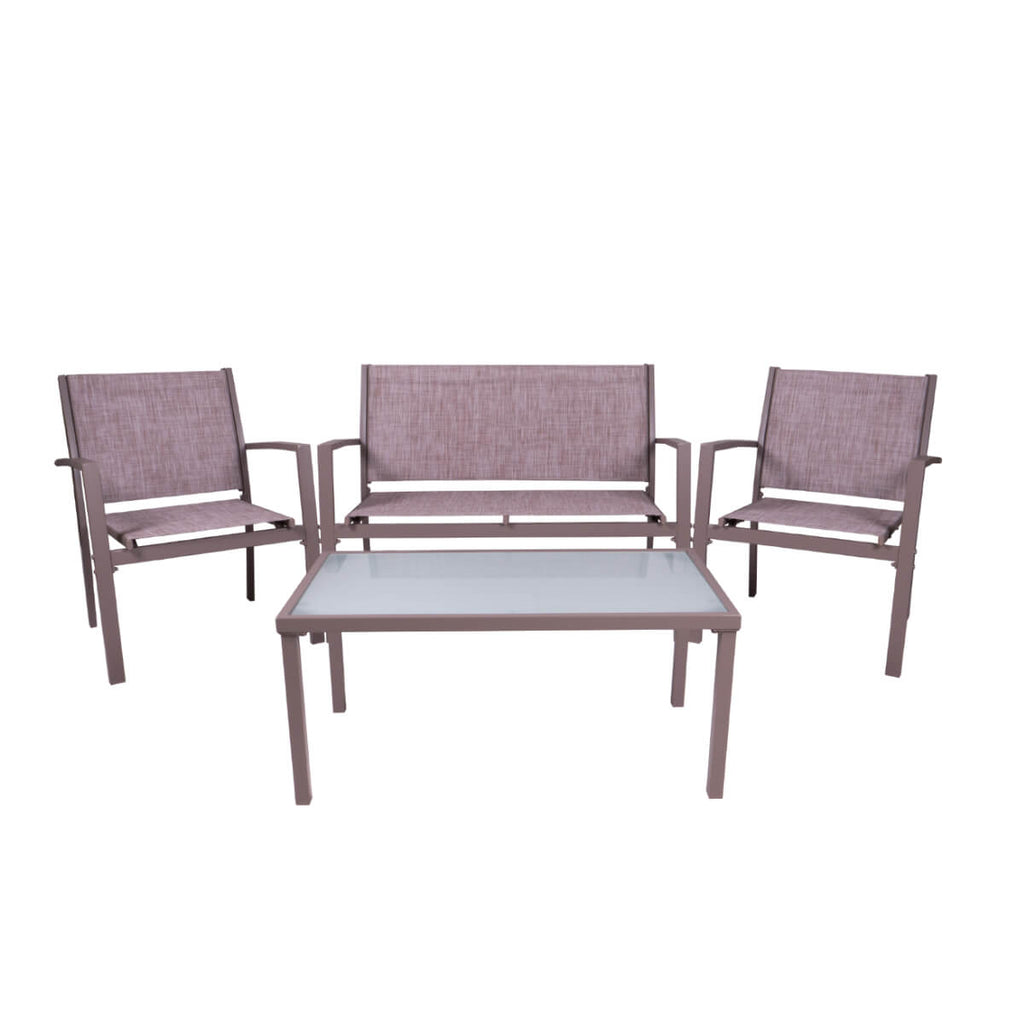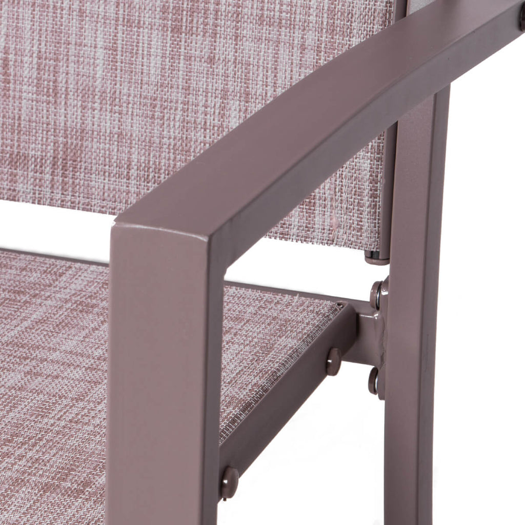 Das Set hat einen Sitz aus Textilene und eine Struktur aus lackiertem Eisen mit einer Garantie von 2 Jahren .