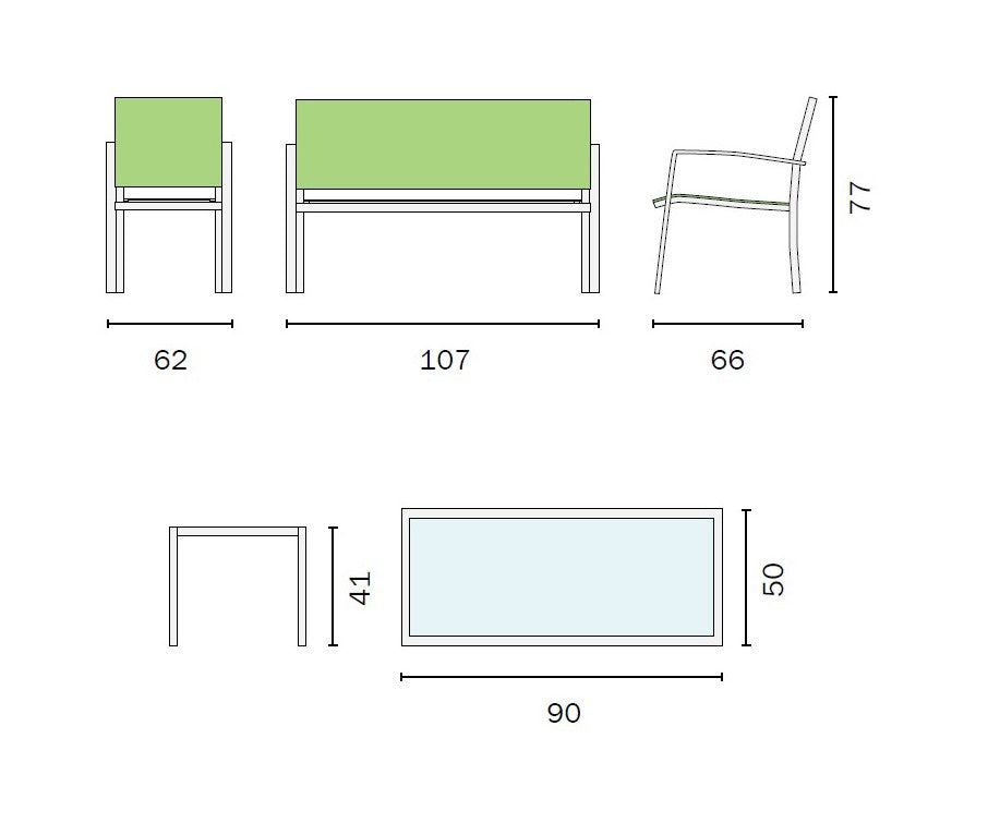 • 1 Sofa: L.107cm x T.66cm x H.77cm.