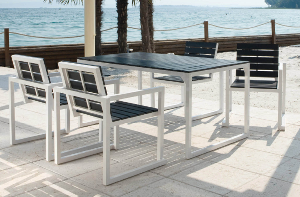 Die Garten-Essgruppe QUICK ist ideal für den Garten oder die Loggia, mit modernen Linien und gleichzeitig komfortabel dank der großen Sitze und des großen Tisches. Aluminiumstruktur. Sitze und Tischplatte aus Kunstholz: die Schönheit von Holz und die Zweckmäßigkeit eines Kunststoffs.