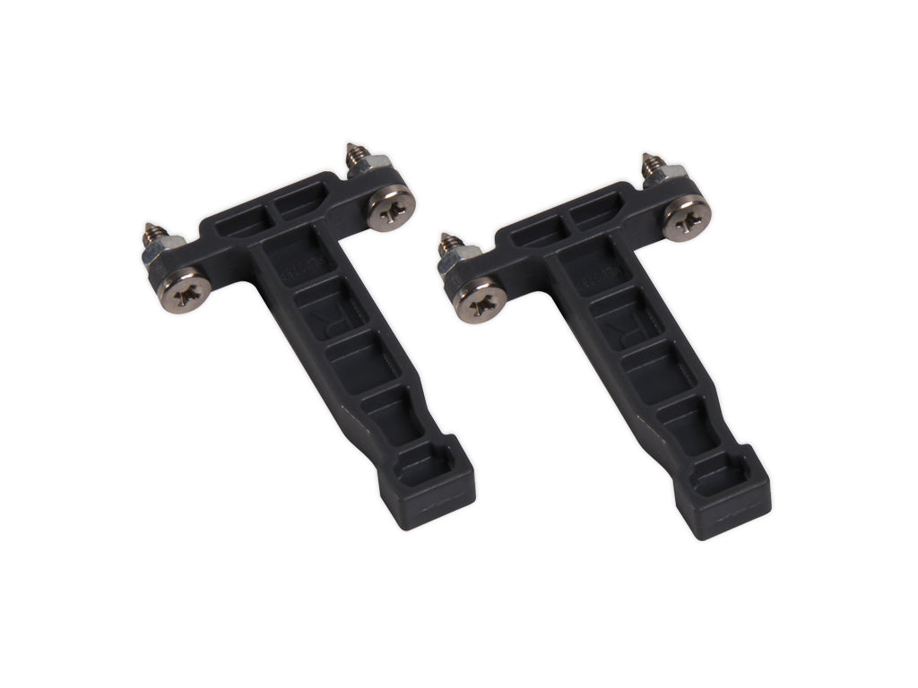 Satz Schablonen für die Installation von Vantage-Q-Schubladenfrontverschlüssen . Mit diesen Formen, rechts und links, stellen wir die horizontale Position der Haken sicher. Die Löcher sind in den Profilen entsprechend der Richtung positioniert und geben die Position der Haken im Loch an.