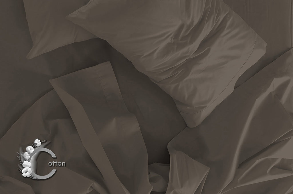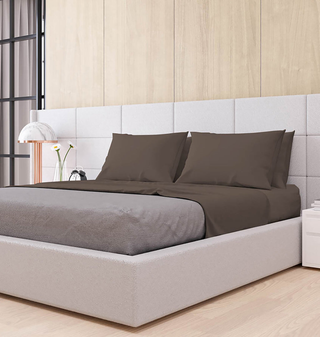 Set aus Doppellaken oben und unten und einfarbigen braunen Kissenbezügen