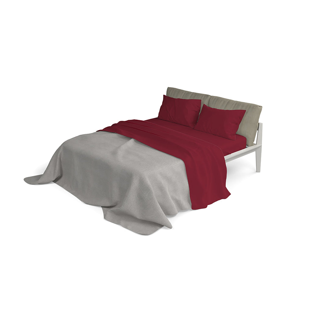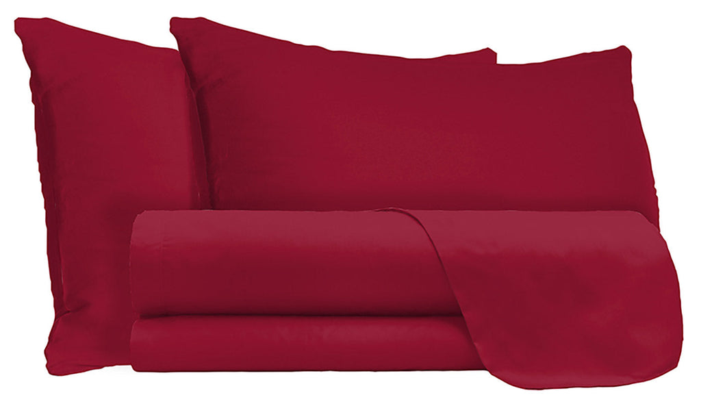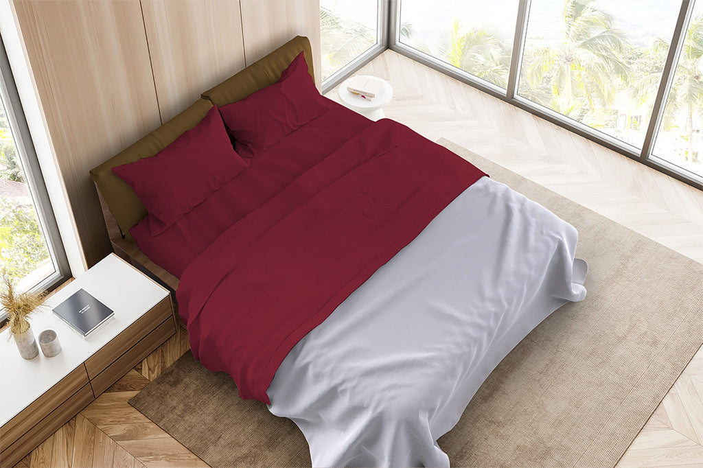 Set aus Doppellaken oben und unten und einfarbigen burgunderroten Kissenbezügen