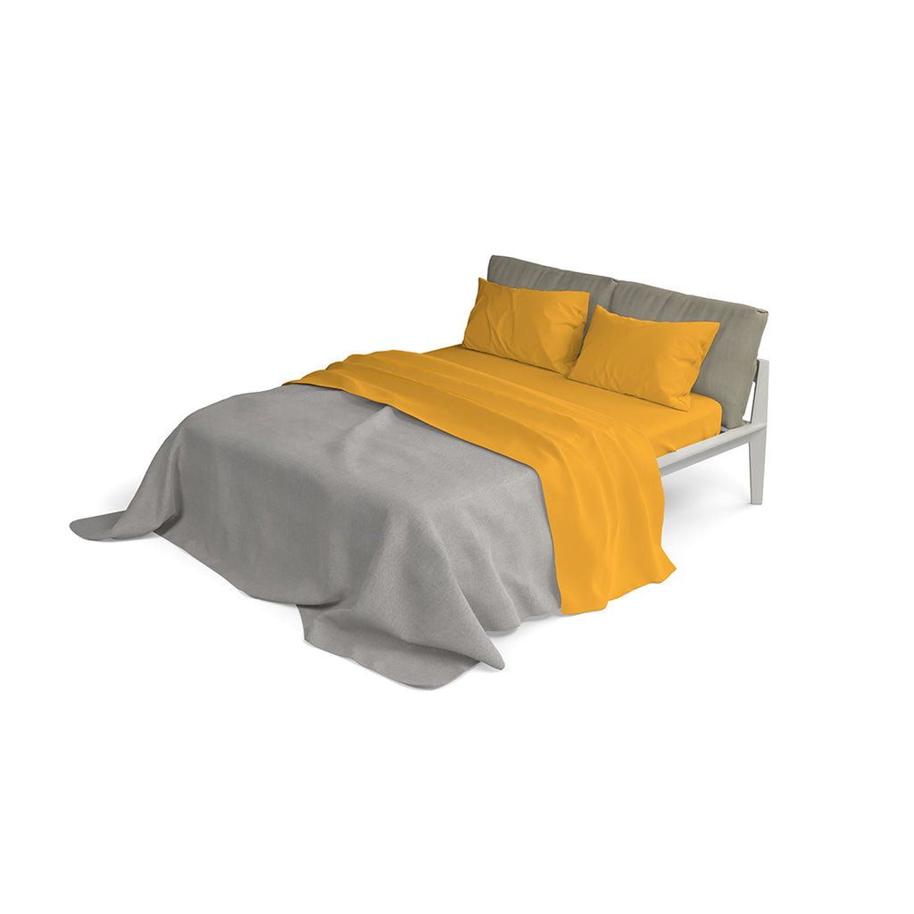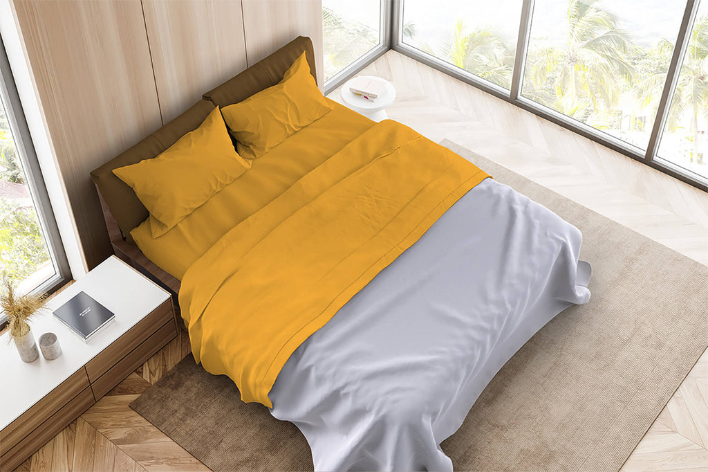 Set aus Doppellaken oben und unten und gelben einfarbigen Kissenbezügen