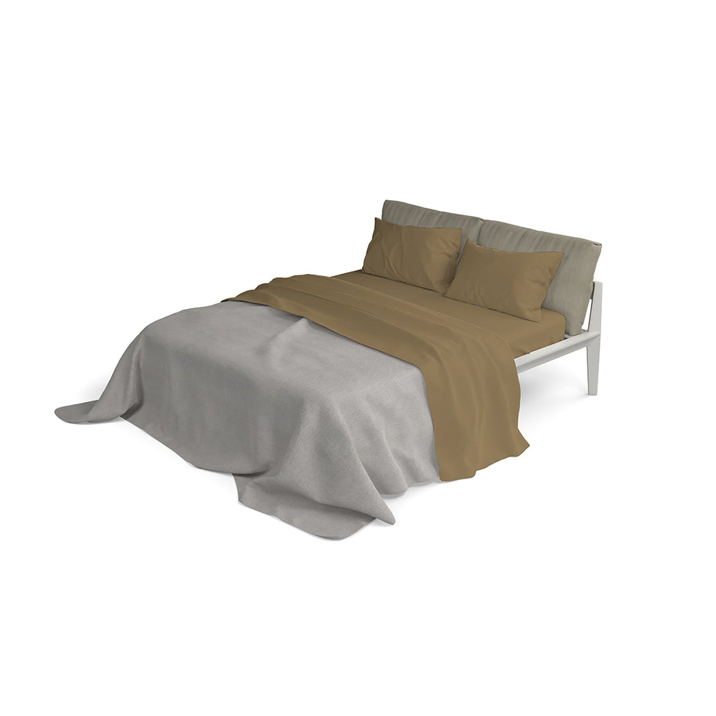 Bettlaken-Set bestehend aus Oberlaken , Unterlaken und Kissenbezügen . Dieses einfarbige Set wurde vollständig in Italien entworfen, zusammengesetzt und genäht und besteht aus sehr weicher Mikrofaser mit einer hypoallergenen " Pfirsichhand " -Behandlung, um es samtig anzufühlen und ein größeres Wärmegefühl zu vermitteln. Die Qualität des Stoffes, die akkuraten Oberflächen und die Verarbeitung erlauben es, das Produkt nicht zu bügeln.