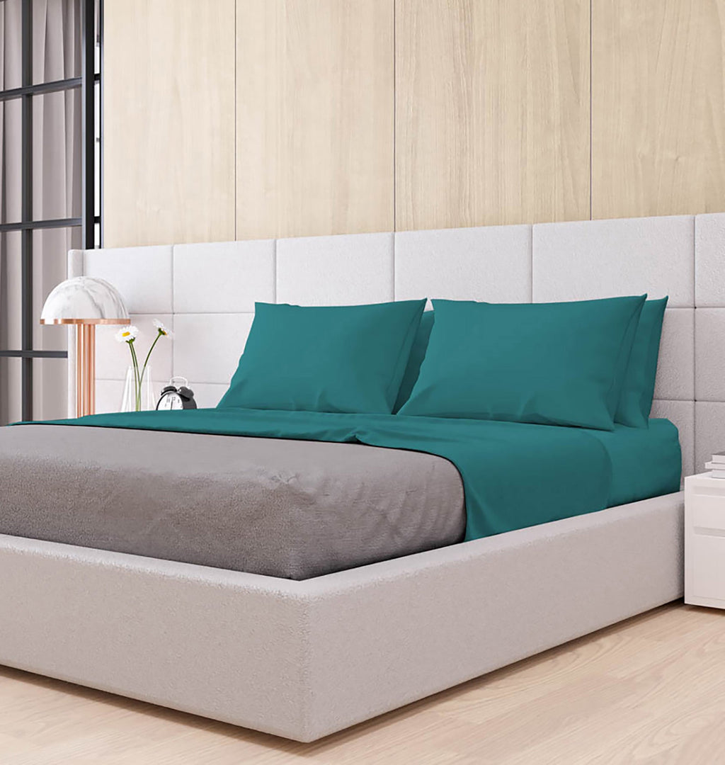 Einfarbiges Bettlaken-Set bestehend aus Oberlaken, Unterlaken und Kissenbezügen. Hergestellt aus feiner Baumwolle, mit besonderem Augenmerk auf die Oberflächen und ein "Finishing" -Verfahren, das den Farben eine besondere Brillanz und eine hohe Waschbeständigkeit verleiht.
