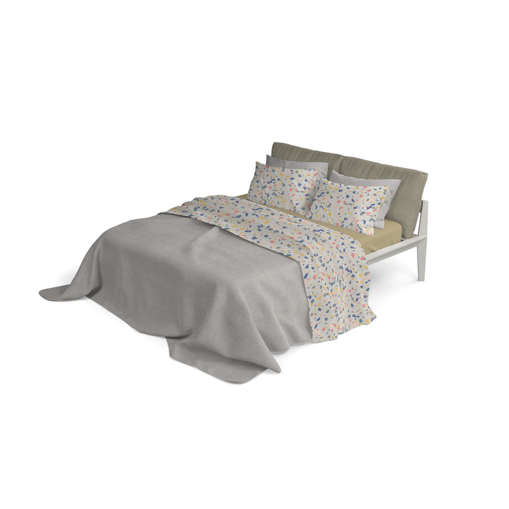 Das Set besteht aus einem Oberlaken , einem Unterlaken und Kissenbezügen . Vollständig in Italien entwickelt, montiert und genäht , aus Mikrofaser , mit präzisen Oberflächen und Veredelungen, die das Bügeln erleichtern. All diese Eigenschaften machen dieses Set aufgrund seiner Eleganz und Schlichtheit zu einem begehrten Produkt. Die Drucke wurden getestet, um langen Waschgängen standzuhalten und die Farben leuchtend zu halten.