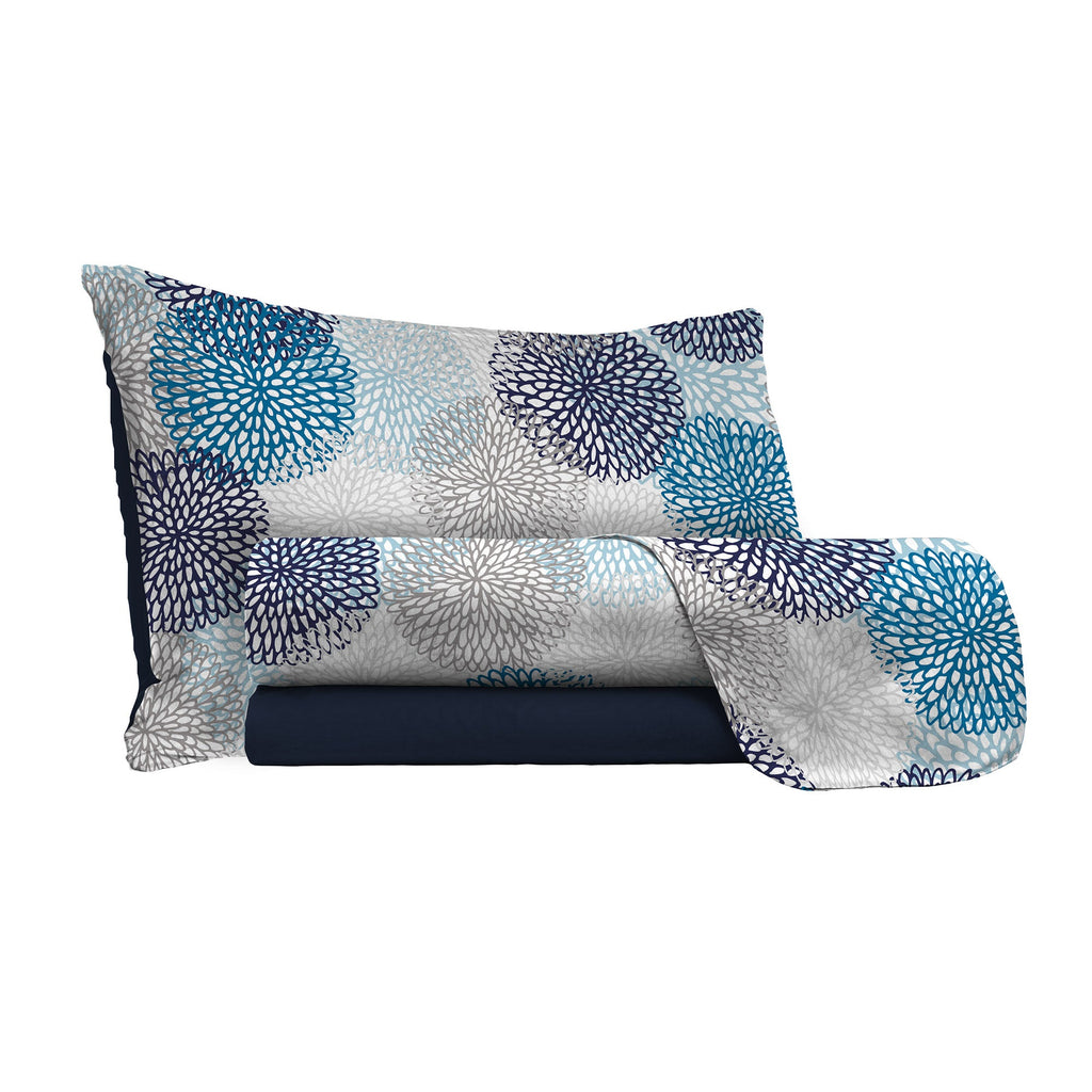 Bettlaken-Set mit Aufdruck oben und unten und blauen Kopfkissenbezügen