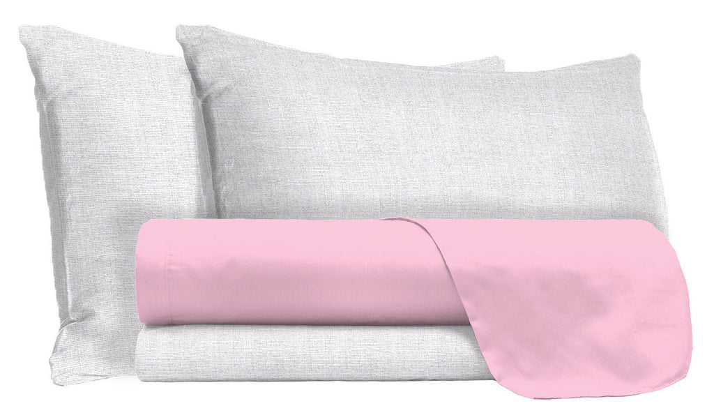 Bettlaken und Kissenbezüge aus rosafarbener Baumwolle in verschiedenen Größen