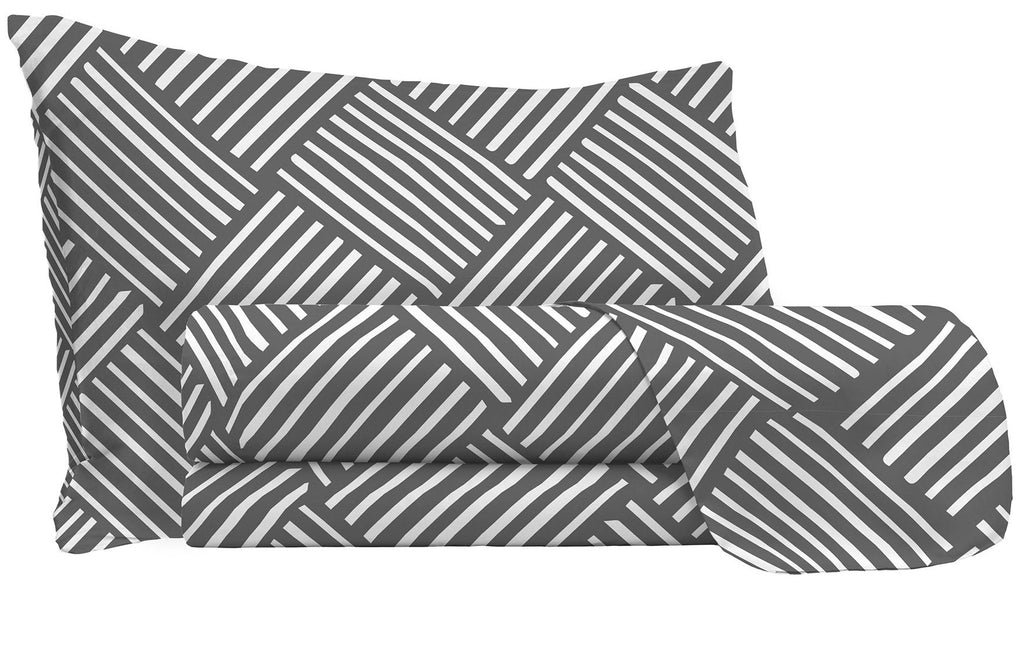 - Einzelbett: Oberseite 150 x 280 cm + Unterseite 90 x 200 cm + Ecken mit Gummiband 25 cm + Kissenbezug 52 x 82 cm + Innenklappe