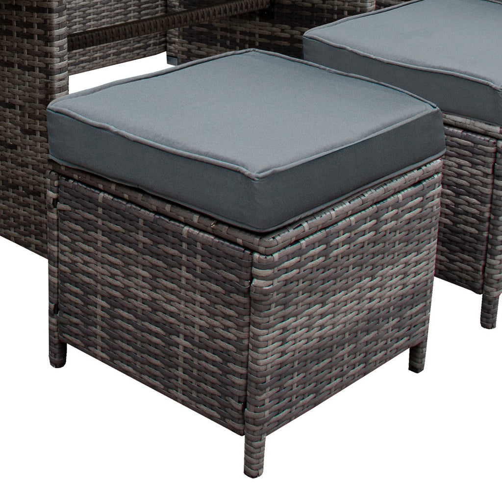 Esalta la tua oasi esterna con il nostro esclusivo set di angolo rattan per pranzare e contenitore di stoccaggio per giardino - una perfetta fusione di eleganza, comfort e funzionalità.