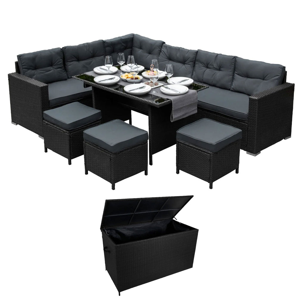Set Salotto da Giardino 240x186x70 cm ad Angolo con Tavolo e Box Contenitore in Rattan Nero