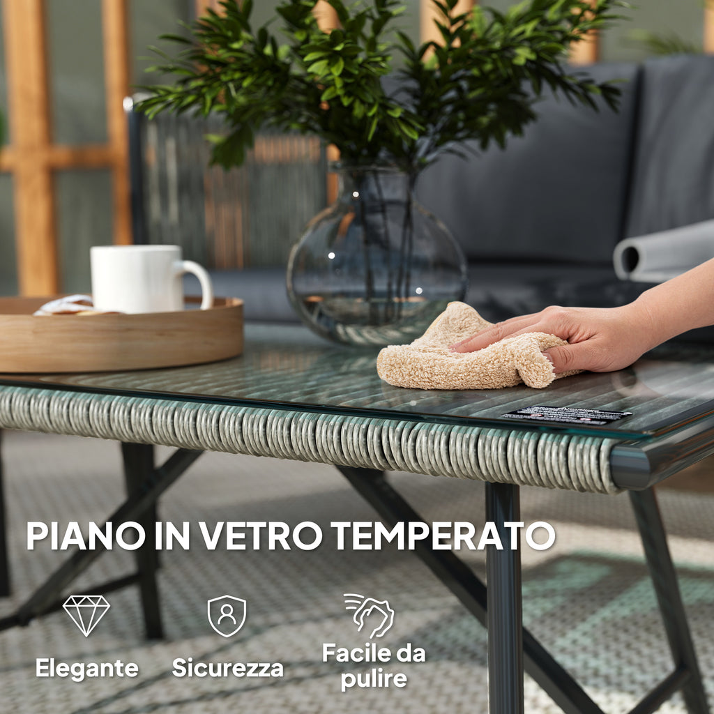 - Materiale: Acciaio, rattan PE, poliestere, vetro temperato, spugna, cotone