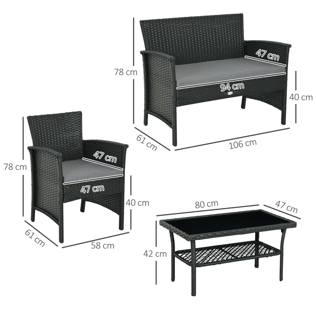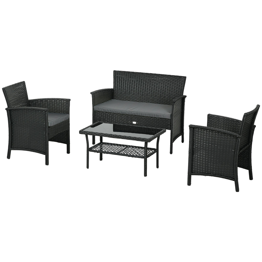 Set Salotto da Giardino Divano 2 Poltrone con Cuscini e Tavolino in Vetro in Rattan PE Nero e Grigio