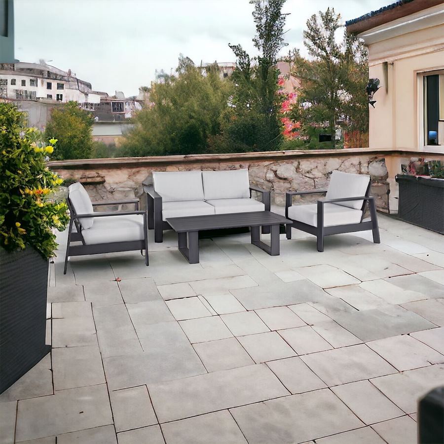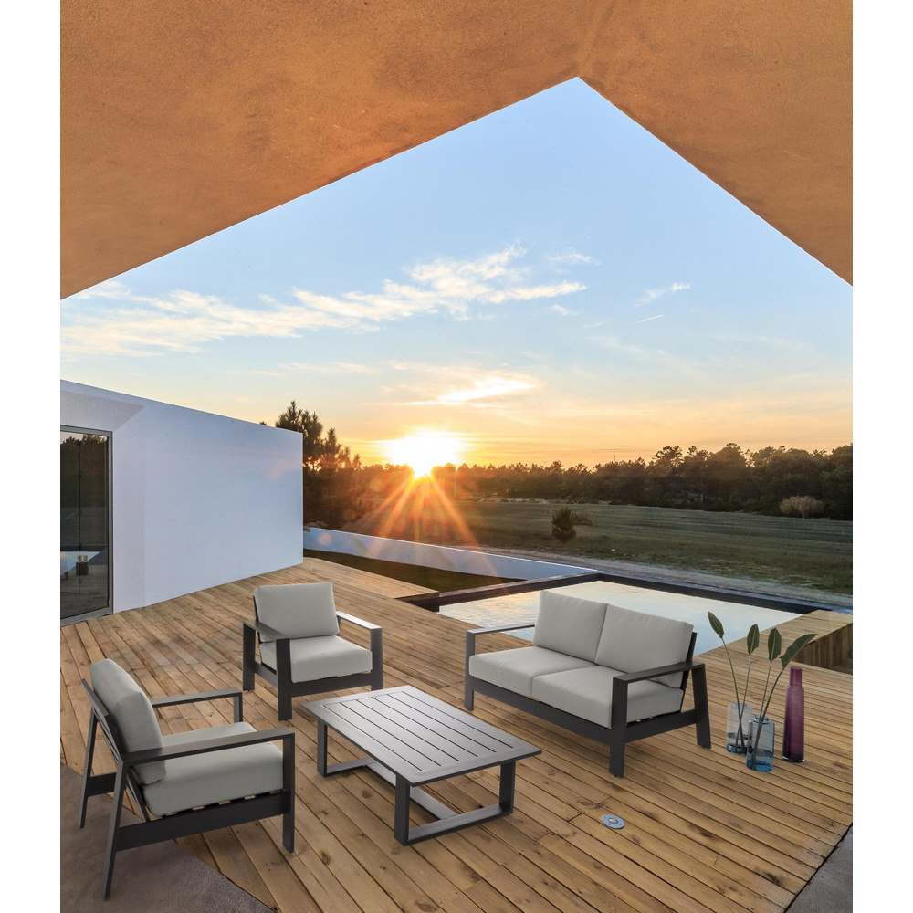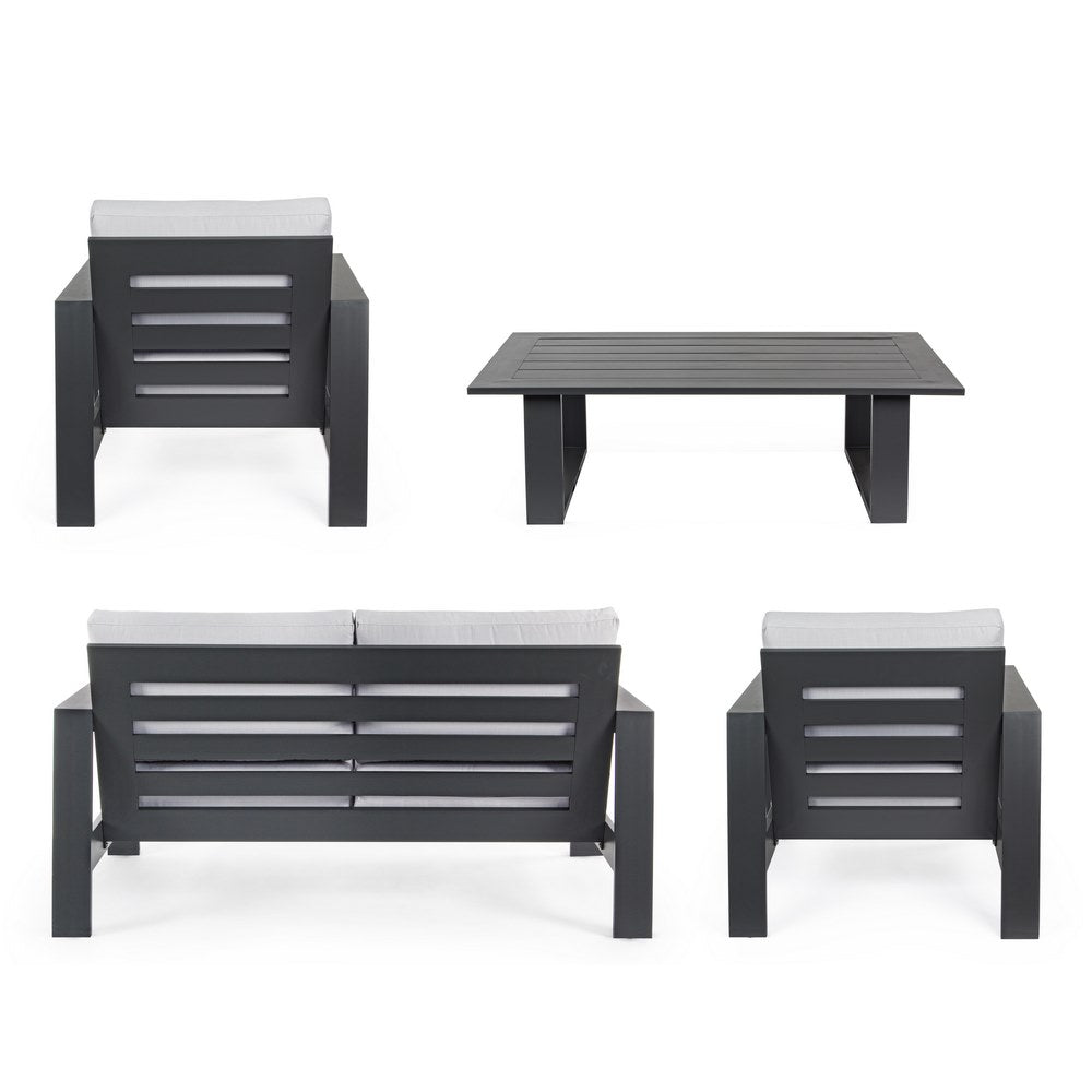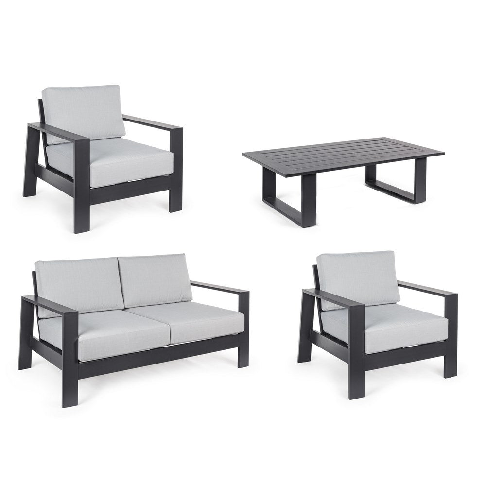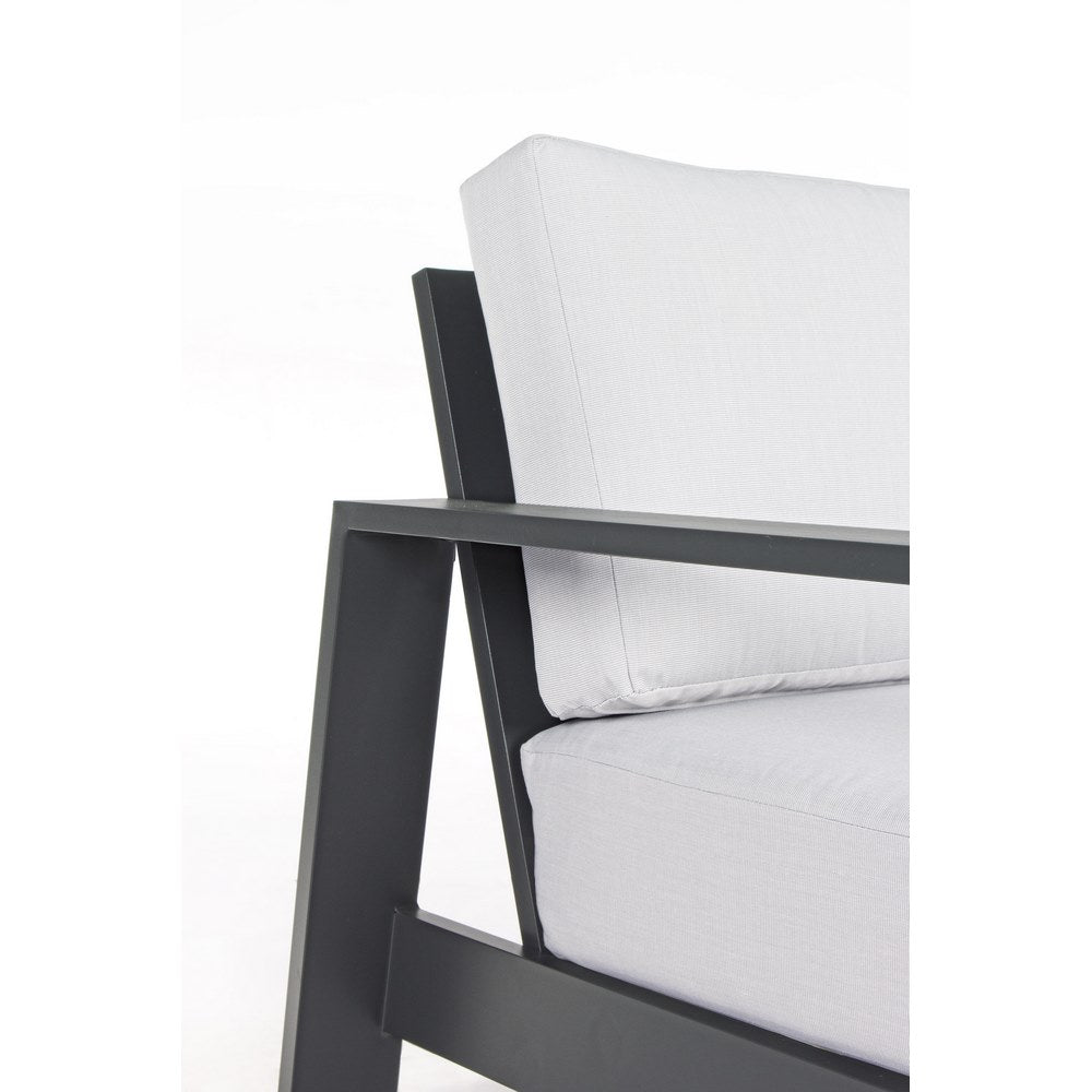 Grazie alla sua robusta struttura in alluminio verniciato a polvere epossidica il set arredo giardino alluminio Bars Grigio è la soluzione ideale per il tuo giardino o terrazzo. Potrai rilassarti e godere dei tuoi spazi esterni senza nessuna preoccupazione, garantendoti una posizione comoda e confortevole grazie alla presenza della cuscineria creata con tessuto olefin (100%polypropylene).