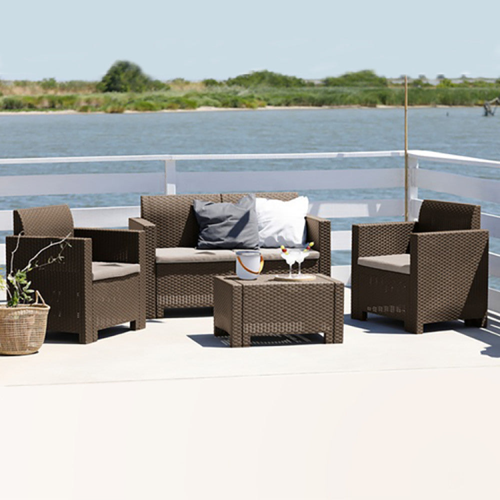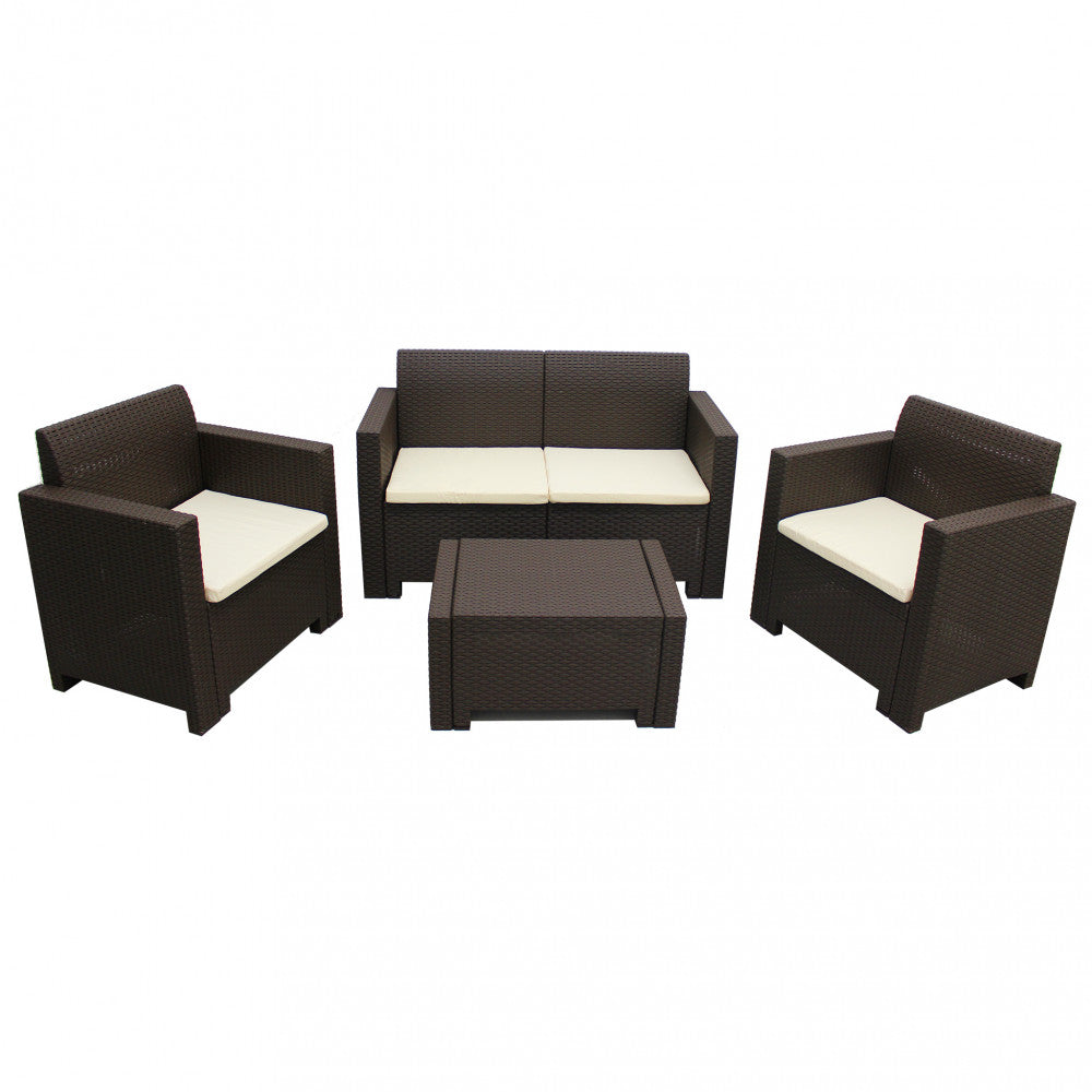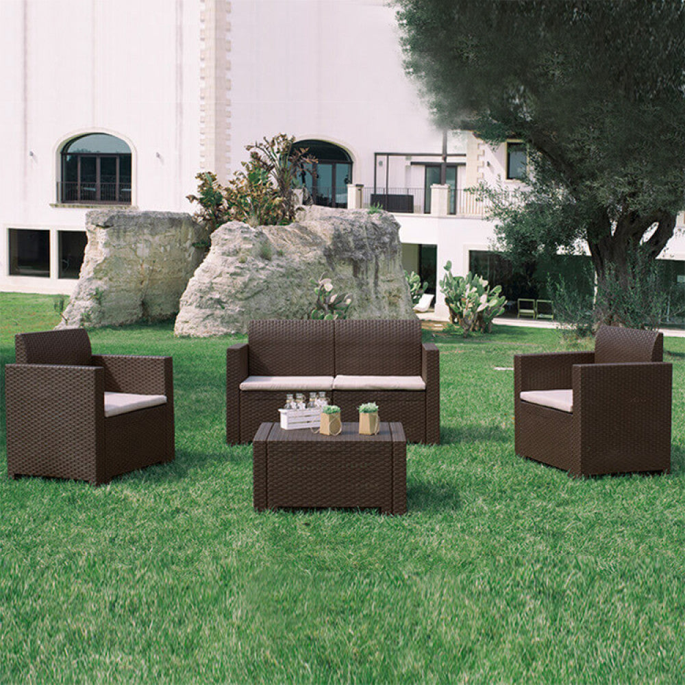 Garden Lounge Set Sofa 2 Sessel und Couchtisch mit Kissen aus braunem Kunststoff