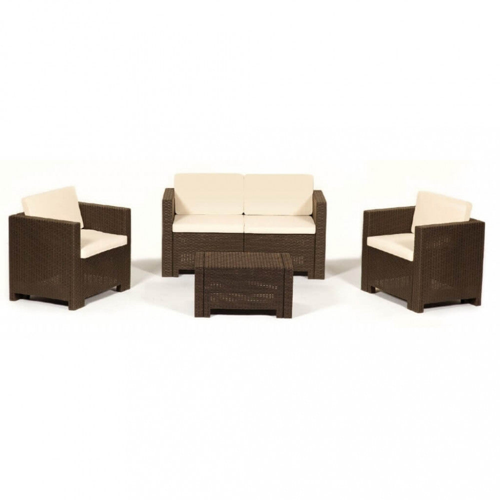 Garden Lounge Set Sofa 2 Sessel und Couchtisch mit Kissen aus braunem Polypropylen