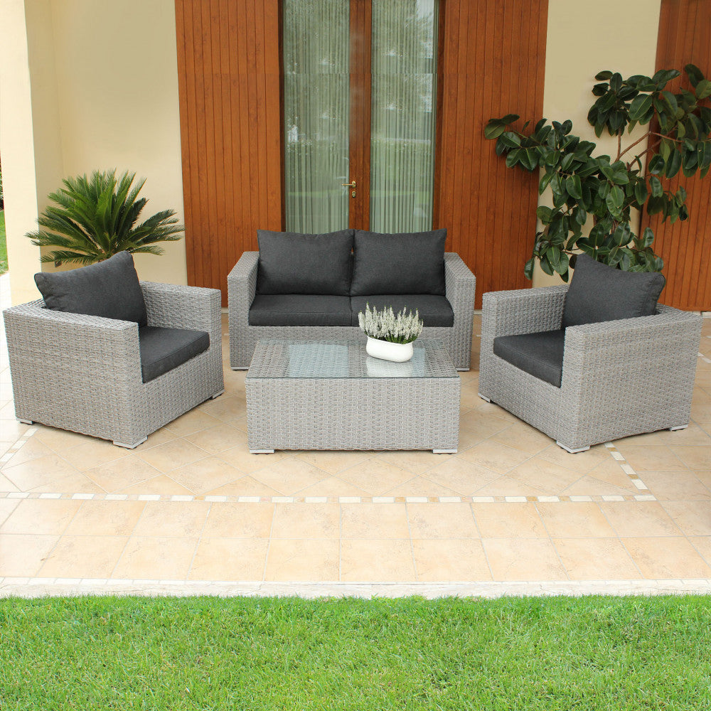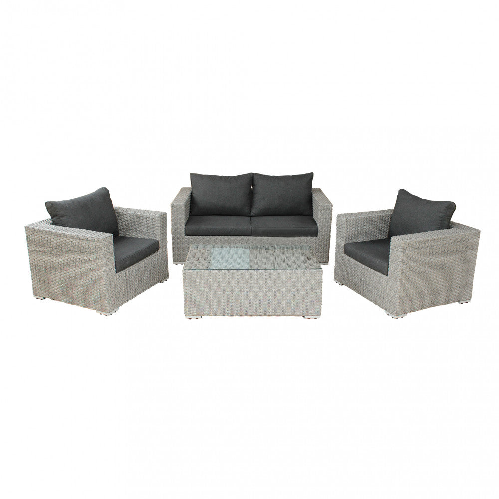 Garden Lounge Set Sofa 2 Sessel und Couchtisch mit Kissen aus grauem Korbgeflecht