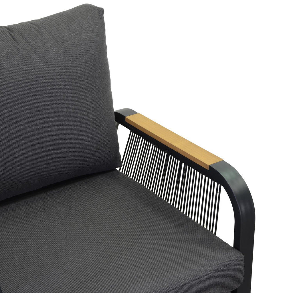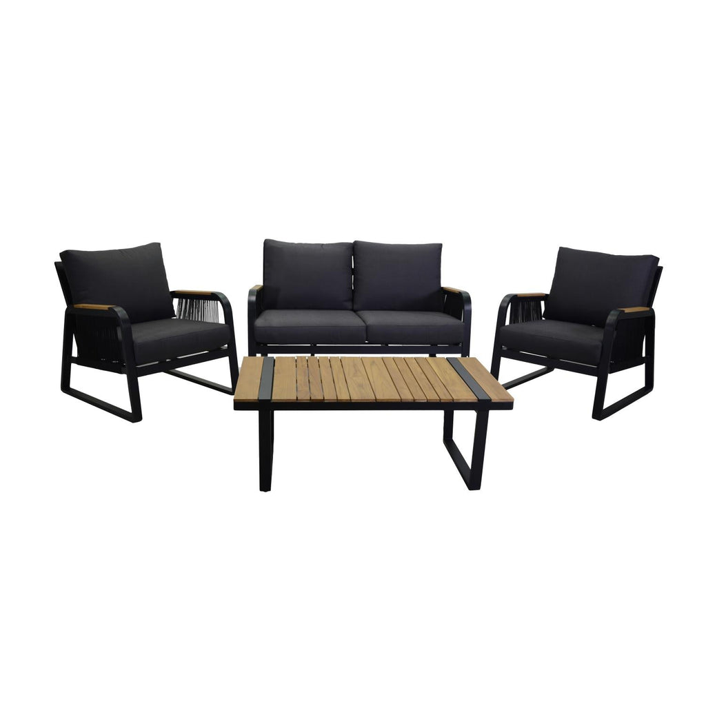 Questo elegante set da giardino è composto da una struttura in alluminio antiruggine color antracite, corde in poliestere intrecciato e cuscini idrorepellenti sfoderabili in grigio scuro. Le poltrone e il divano offrono un comfort ottimale grazie ai cuscini spessi da 12 cm. Il tavolino, con top in alluminio e legno teak dal Brasile, aggiunge un tocco di stile alla tua area outdoor. Facile da montare e smontare, questo set garantisce anche una comoda manutenzione.