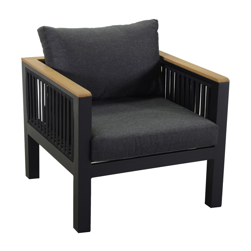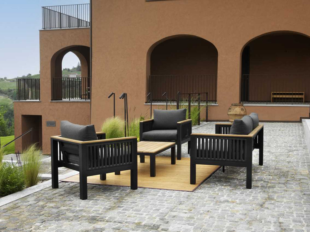 Il divano da giardino è caratterizzato da una struttura in alluminio antiruggine verniciato a polvere color antracite, corde dello stesso colore e cuscini idrorepellenti grigio scuro sfoderabili. Il top del tavolo e i braccioli sono realizzati in legno TEAK dal Brasile, mentre la seduta del divano arriva smontata. Il divano ha dimensioni di cm 174,5x76h64,5, con una seduta di cm 60x161 e cuscini spessi 10cm. La poltrona ha dimensioni di cm 75x76h64,5 e una seduta di cm 60x61, con cuscini di varie dimensioni e il tavolo è di cm 59,5x35,5x110.