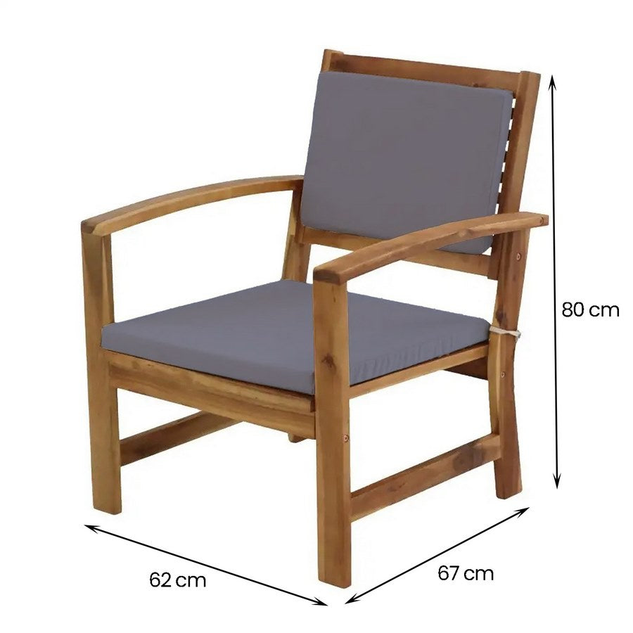 Il set da giardino in legno di acacia oliata Sassari è un'ottima scelta per arredare il tuo spazio esterno con stile e comfort. Questo set è composto da un divanetto, due poltrone e un tavolino, tutti realizzati in legno di acacia di alta qualità. Il divanetto e le poltrone sono dotati di cuscini imbottiti sia sulla seduta che sullo schienale, offrendo un comfort ottimale per rilassarsi all'aperto. I cuscini in questa versione, sono di colore grigio e sono realizzati in tessuto resistente alle intemperie, in modo da poterli lasciare all'esterno senza preoccupazioni. Il design del set è elegante e moderno, con linee pulite e curve armoniose.