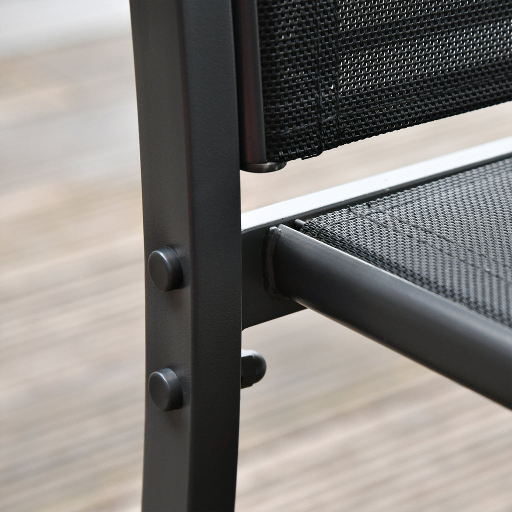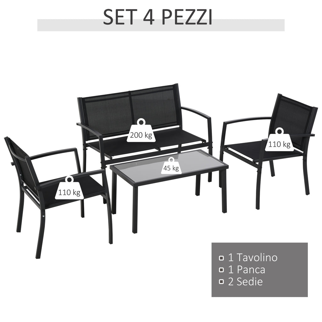 Frühstücken Sie gerne im Garten? Dieses Set aus Gartentisch und Stühlen ist perfekt für einen Kaffee im Freien. Enthält 4 Teile: einen Couchtisch, zwei Stühle und eine Bank aus pulverbeschichtetem Metall mit schwarzem Finish. Die Sitzflächen und Rückenlehnen sind aus atmungsaktivem Textilene, dem perfekten Material für heiße Sommertage.